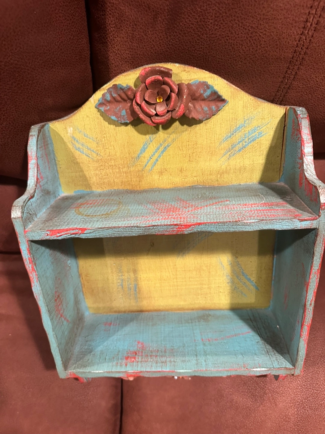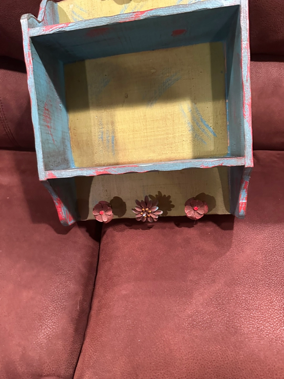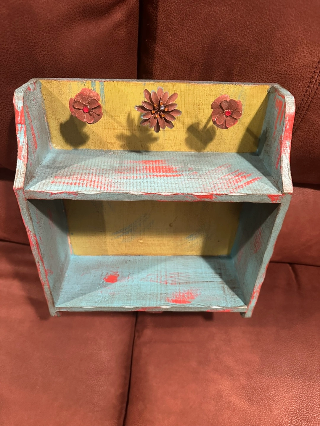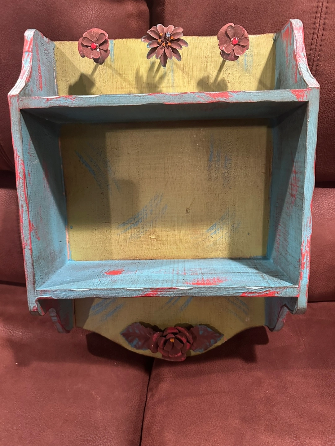 Charming two-shelf wall organizer. Hand-painted teal and green finish. Features decorative metal and wooden flower accents. Perfect for small spaces.