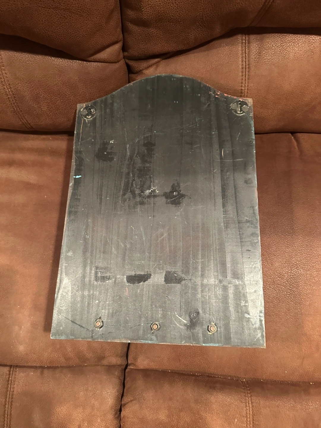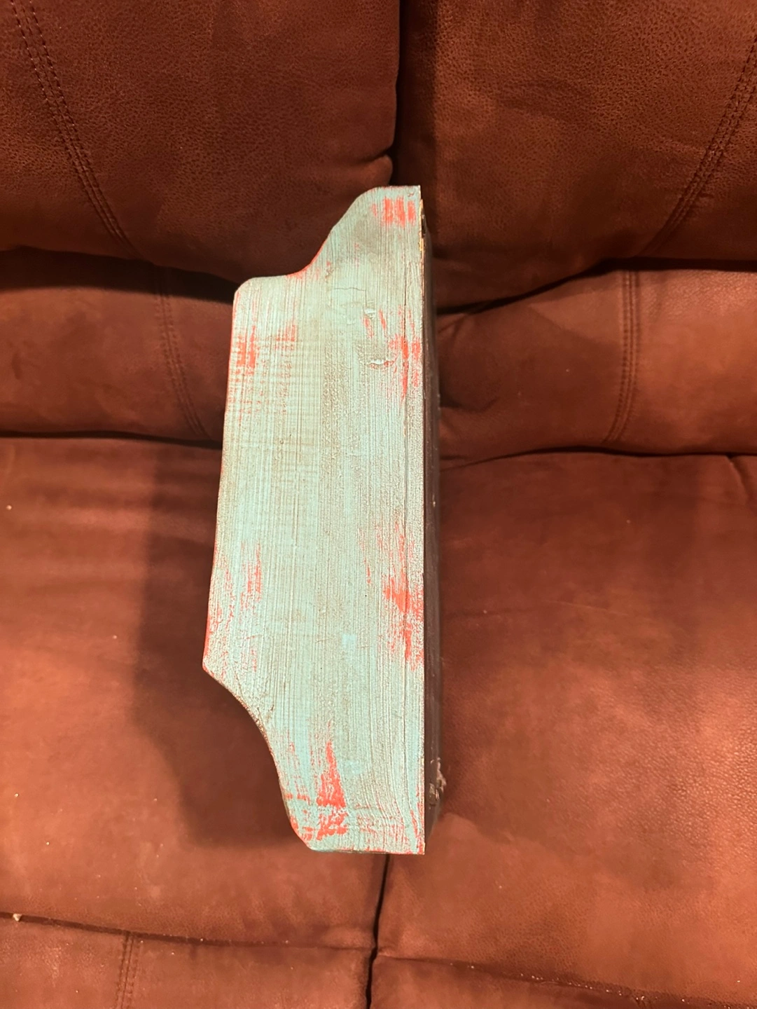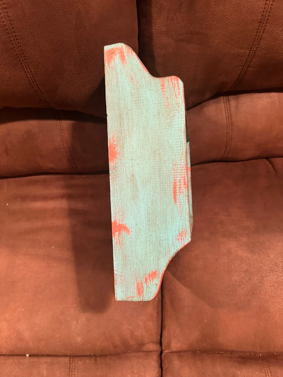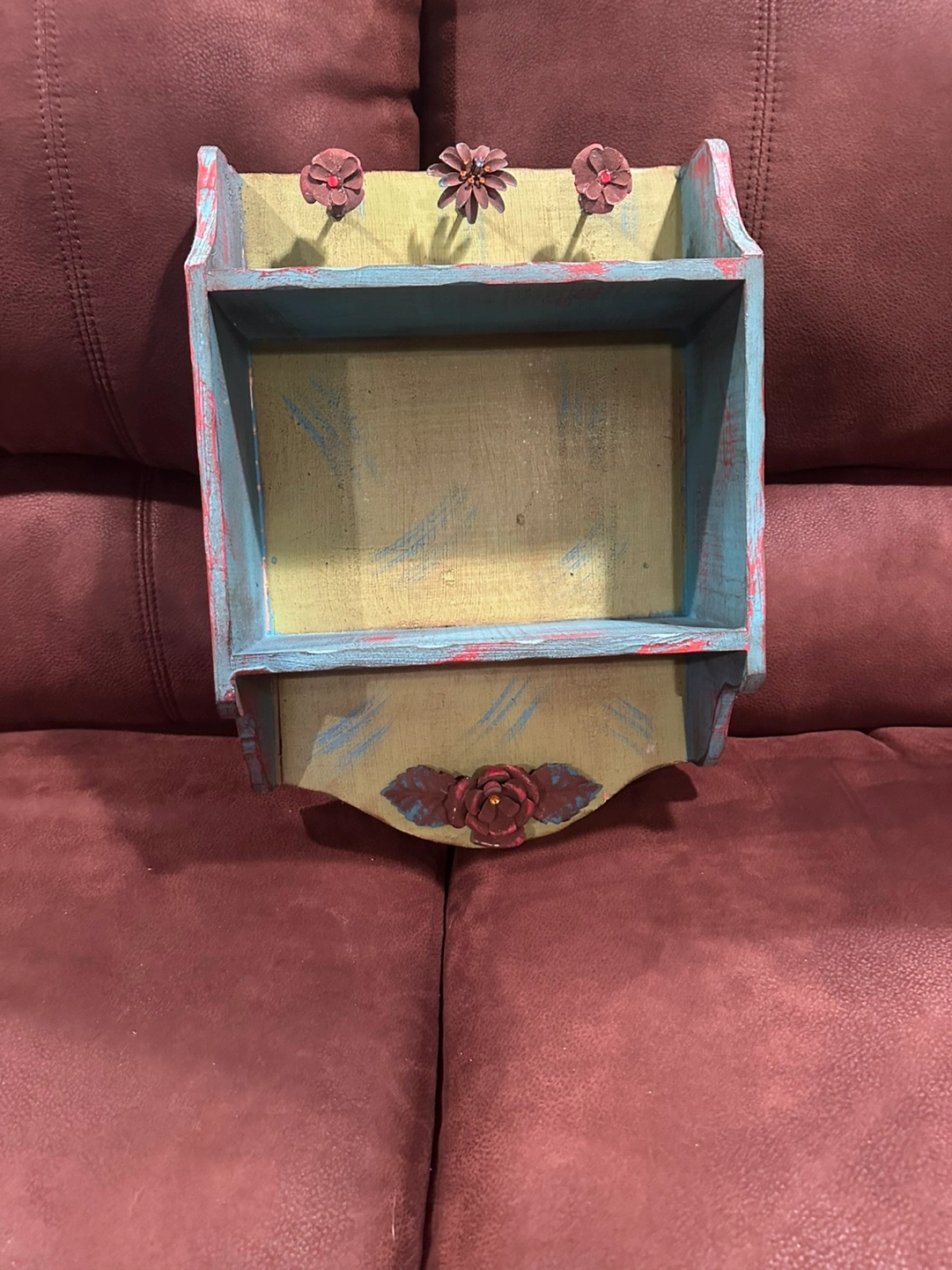 Charming two-shelf wall organizer. Hand-painted teal and green finish. Features decorative metal and wooden flower accents. Perfect for small spaces.