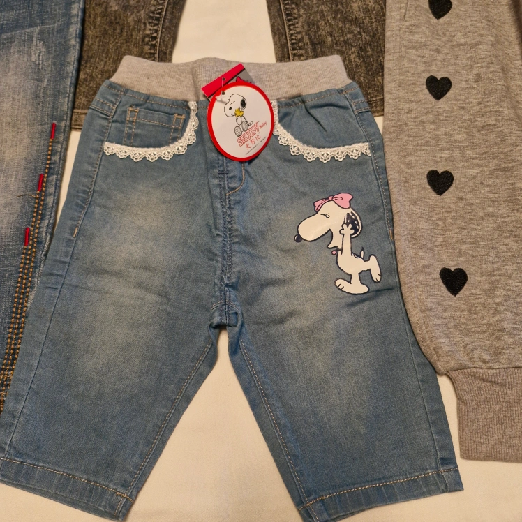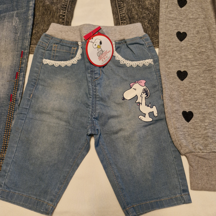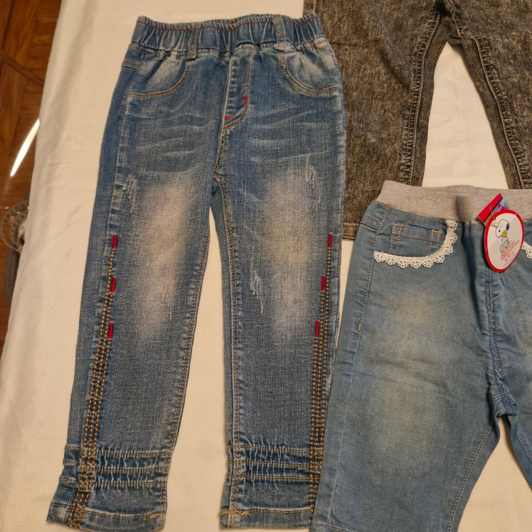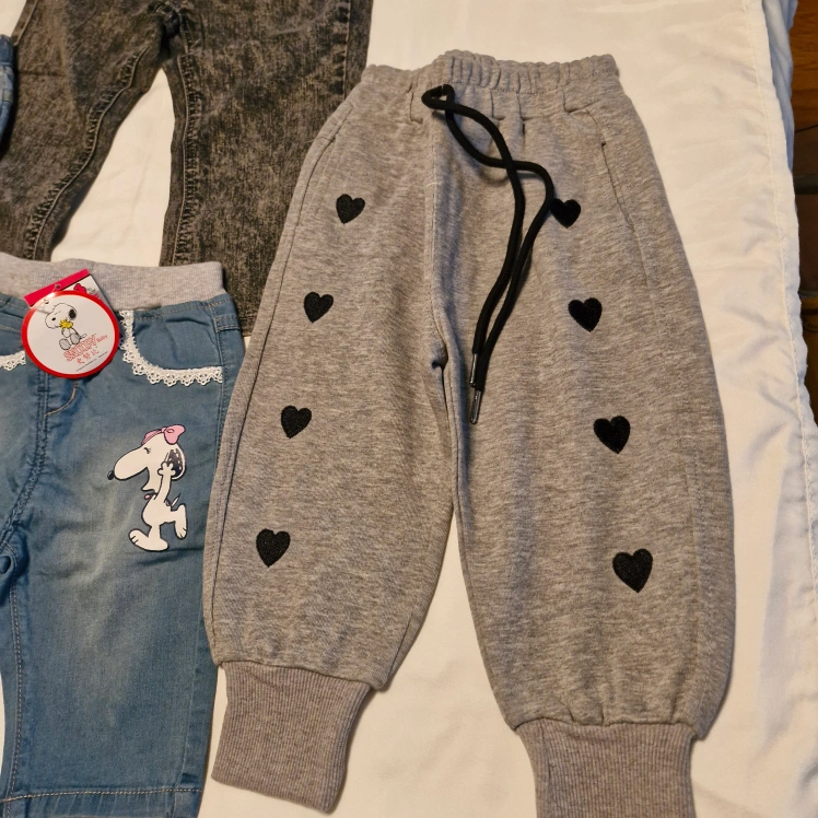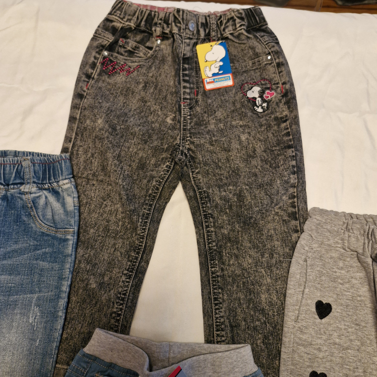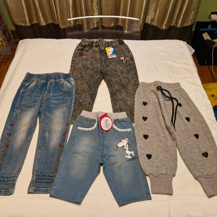 Four pieces of toddler girl's clothing. Includes three pairs of jeans, two light wash and one dark wash acid wash, and one pair of grey sweatpants with black hearts. Some jeans feature embroidered details. Sizes vary.