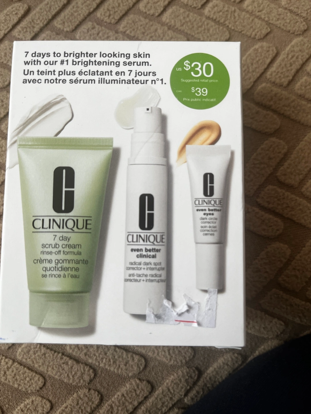 Clinique skincare set. Includes 7-day scrub cream, Even Better Clinical radical dark spot corrector, and Even Better Eyes dark circle corrector. Brightening serum included.