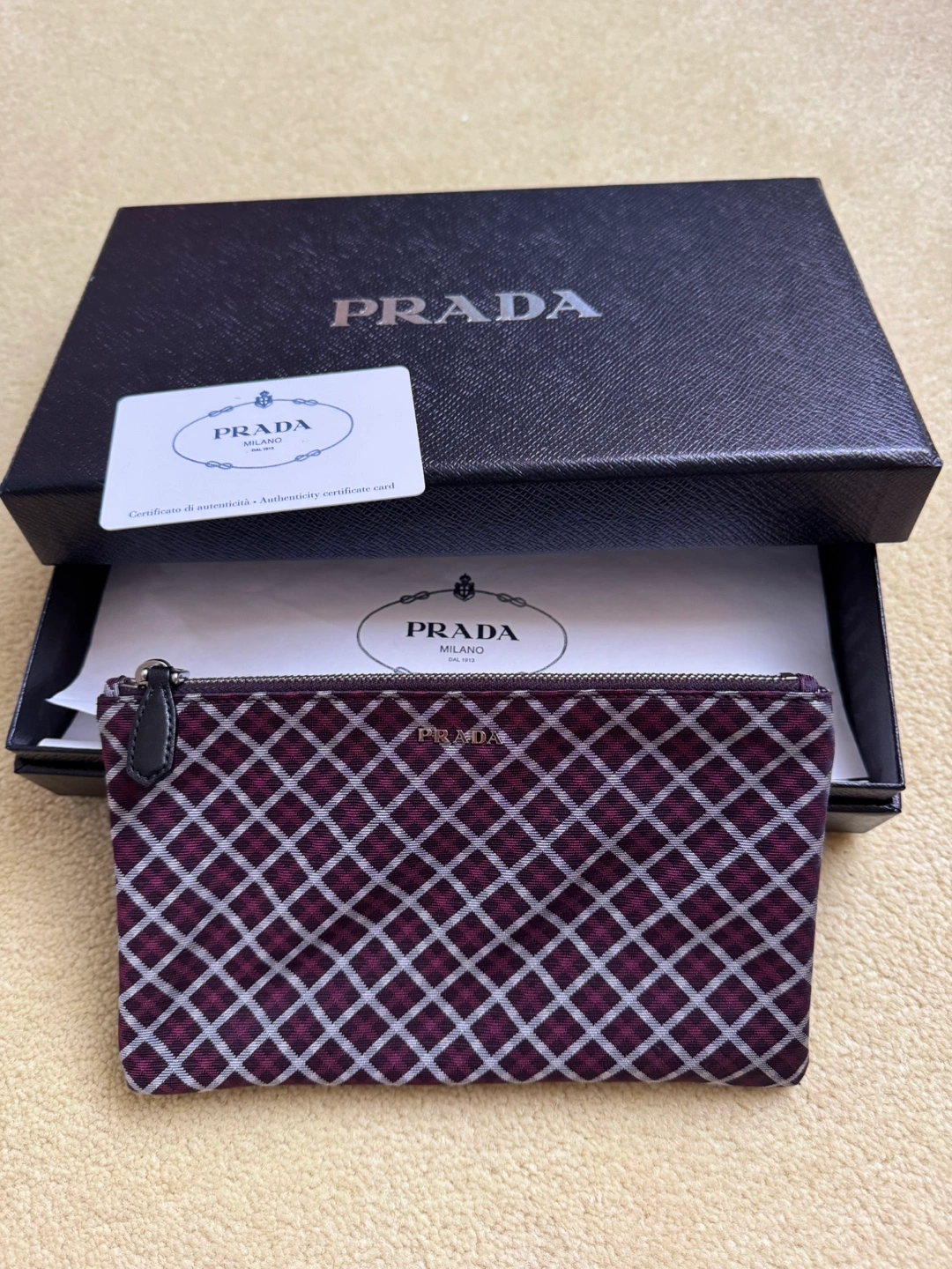 Gorgeous Prada cosmetic pouch. Features a burgundy and grey geometric pattern. Silver zipper closure. Comes with original Prada box and authenticity certificate card.