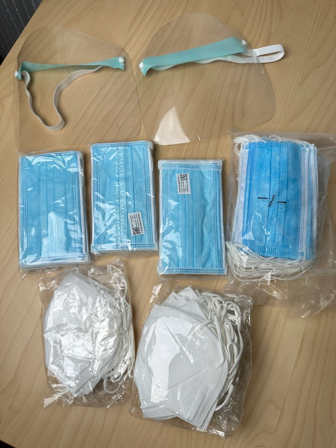Large quantity of personal protective equipment. Includes KN95 masks, disposable face masks, and face shields. new and some unopened. Perfect for businesses or large families.