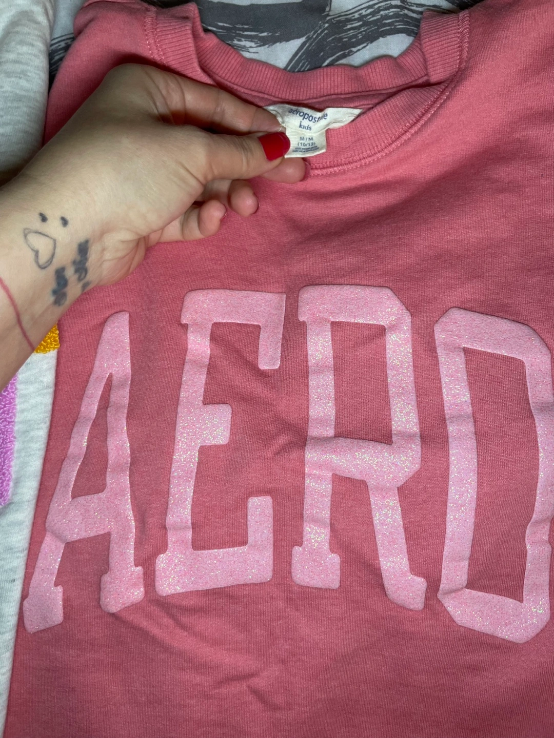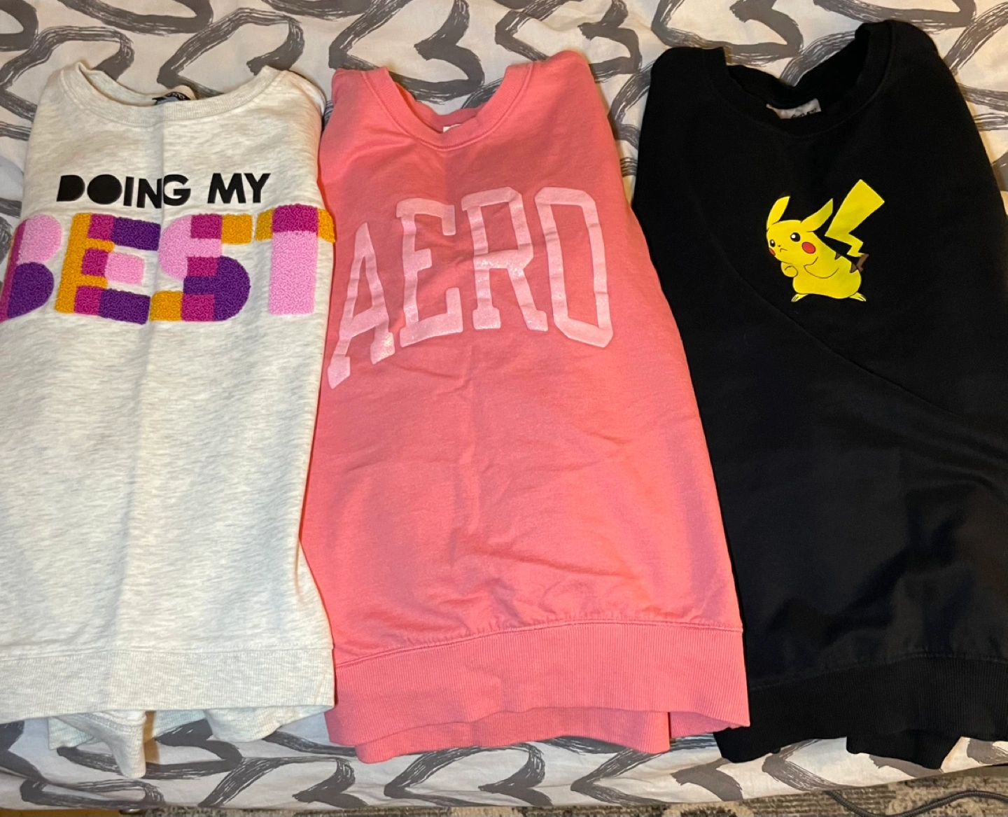 Three girls' sweatshirts in a bundle. One grey sweatshirt features colourful embroidered lettering. Another pink sweatshirt has an embroidered Aeropostale logo. The last black sweatshirt displays a Pikachu graphic and Pokémon lettering on the sleeve. Sizes m-l.