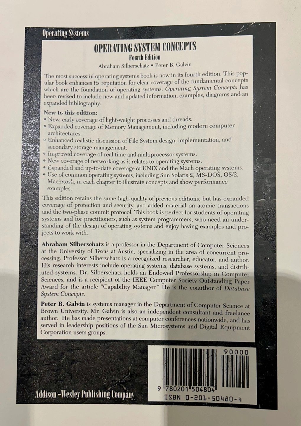 Fourth edition. Authors: Silberschatz and Galvin. Covers operating systems concepts. Includes diagrams and examples. Good for students and practitioners.