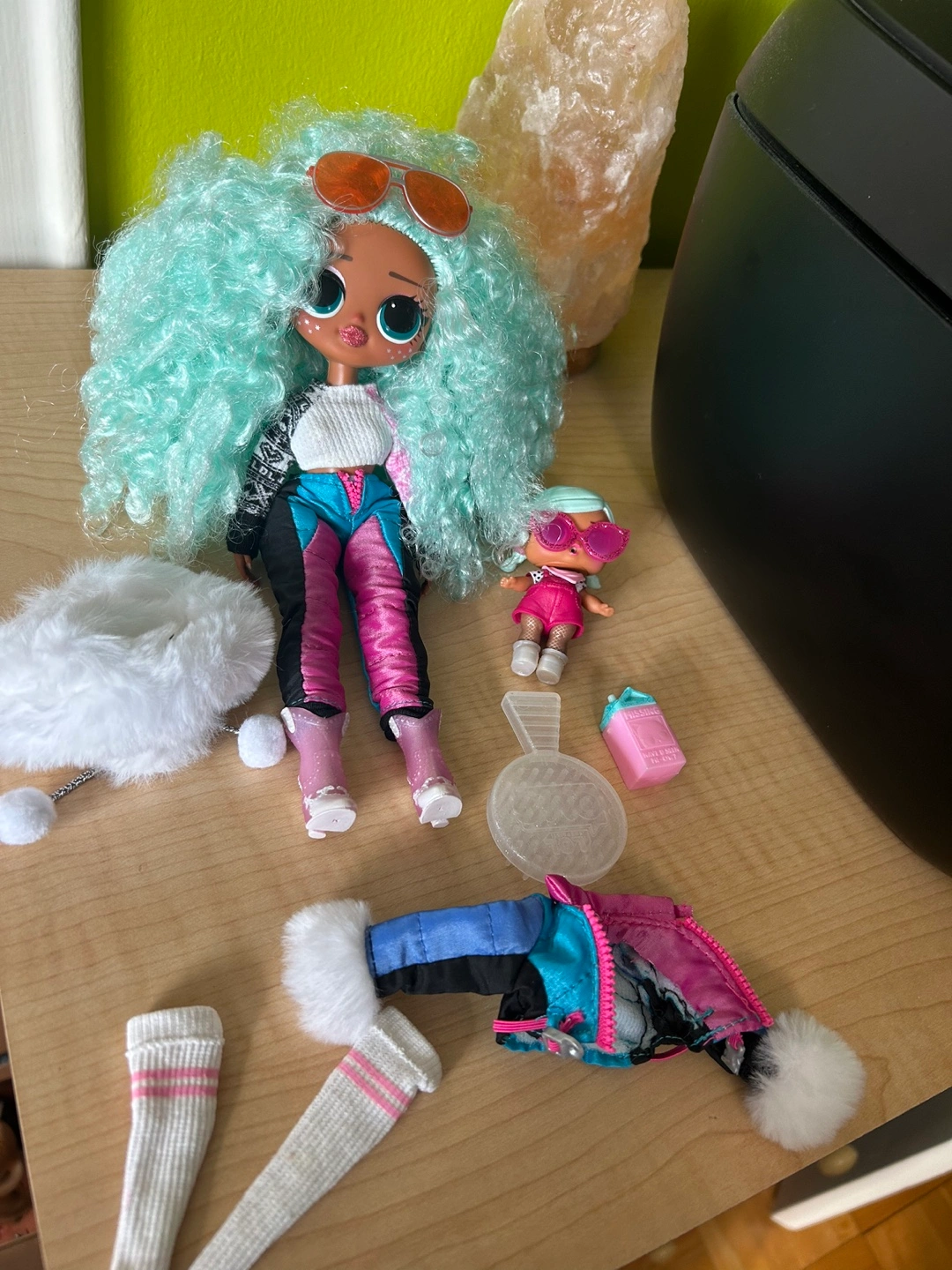 Overall great condition. Icy Gurl has some bangs cut but with the curliness of the hair, it’s hard to notice. She has a bunch of original pieces and includes a similar looking lol tot with clothing and accessories.