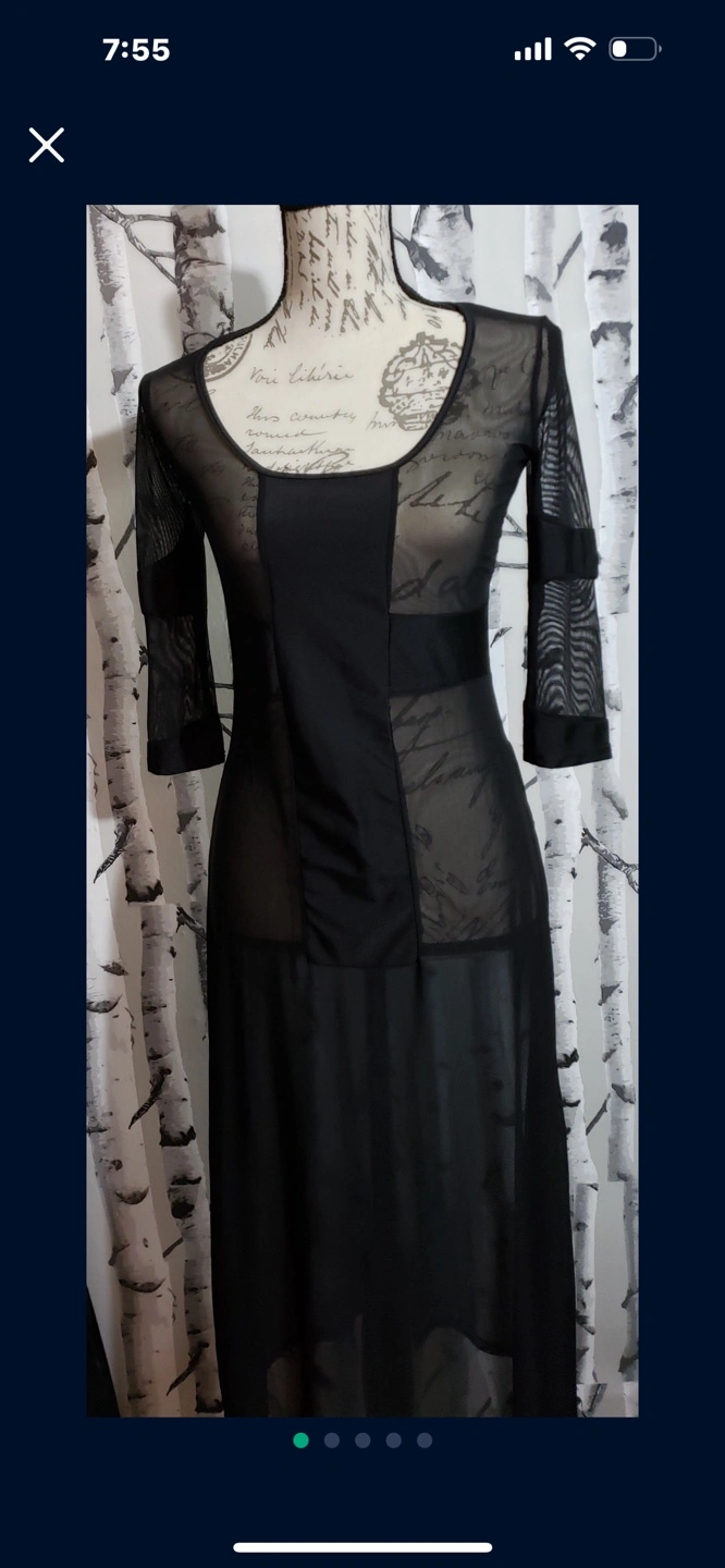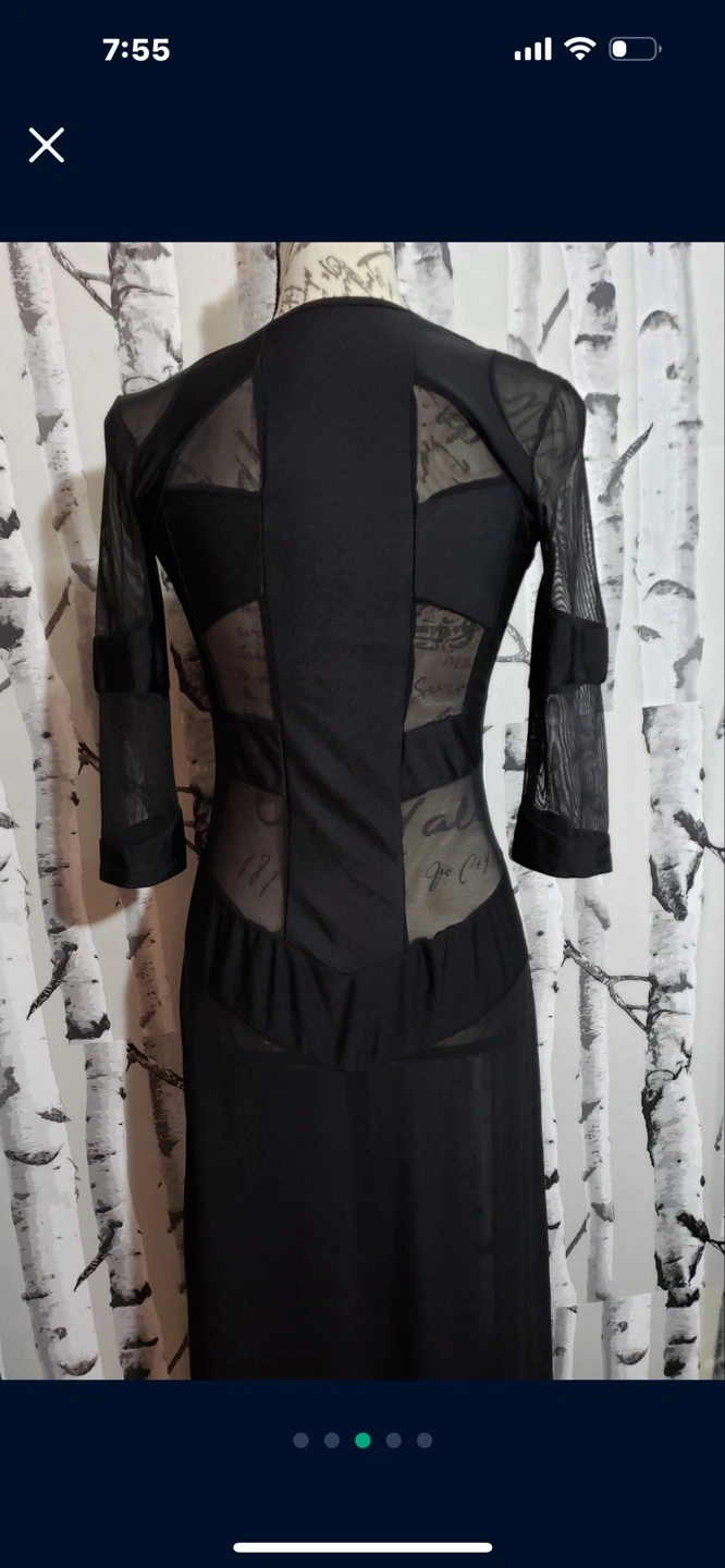 Elegant black maxi dress. Sheer mesh overlay. 3/4 length sleeves. Unique cutouts and panels. Flowy silhouette. Perfect for a special occasion.