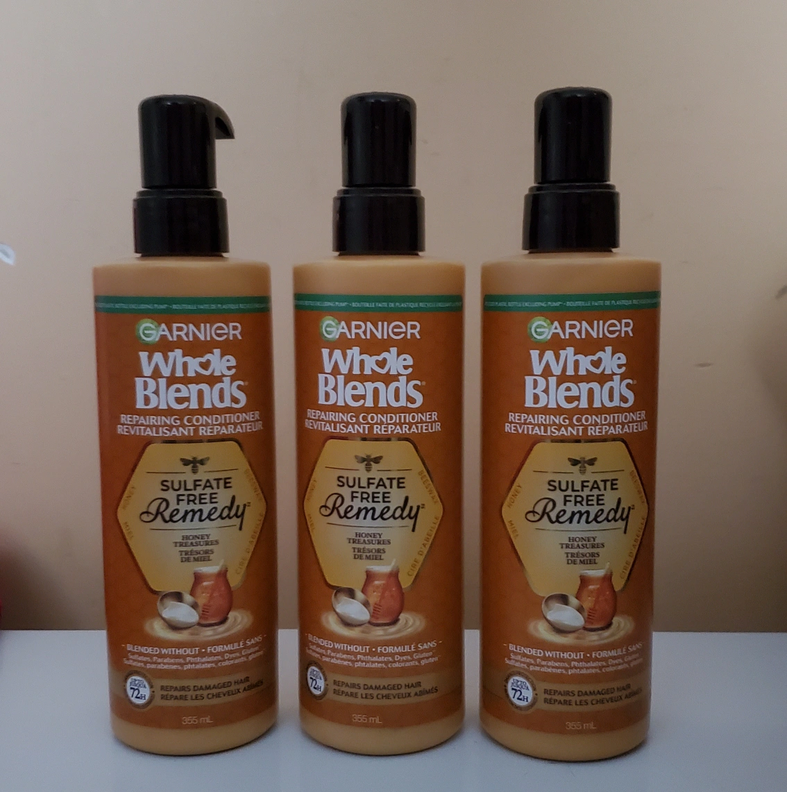 Three bottles of Garnier Whole Blends Sulfate Free Remedy repairing conditioner. Honey Treasures scent. 355 mL each. Repairs damaged hair.