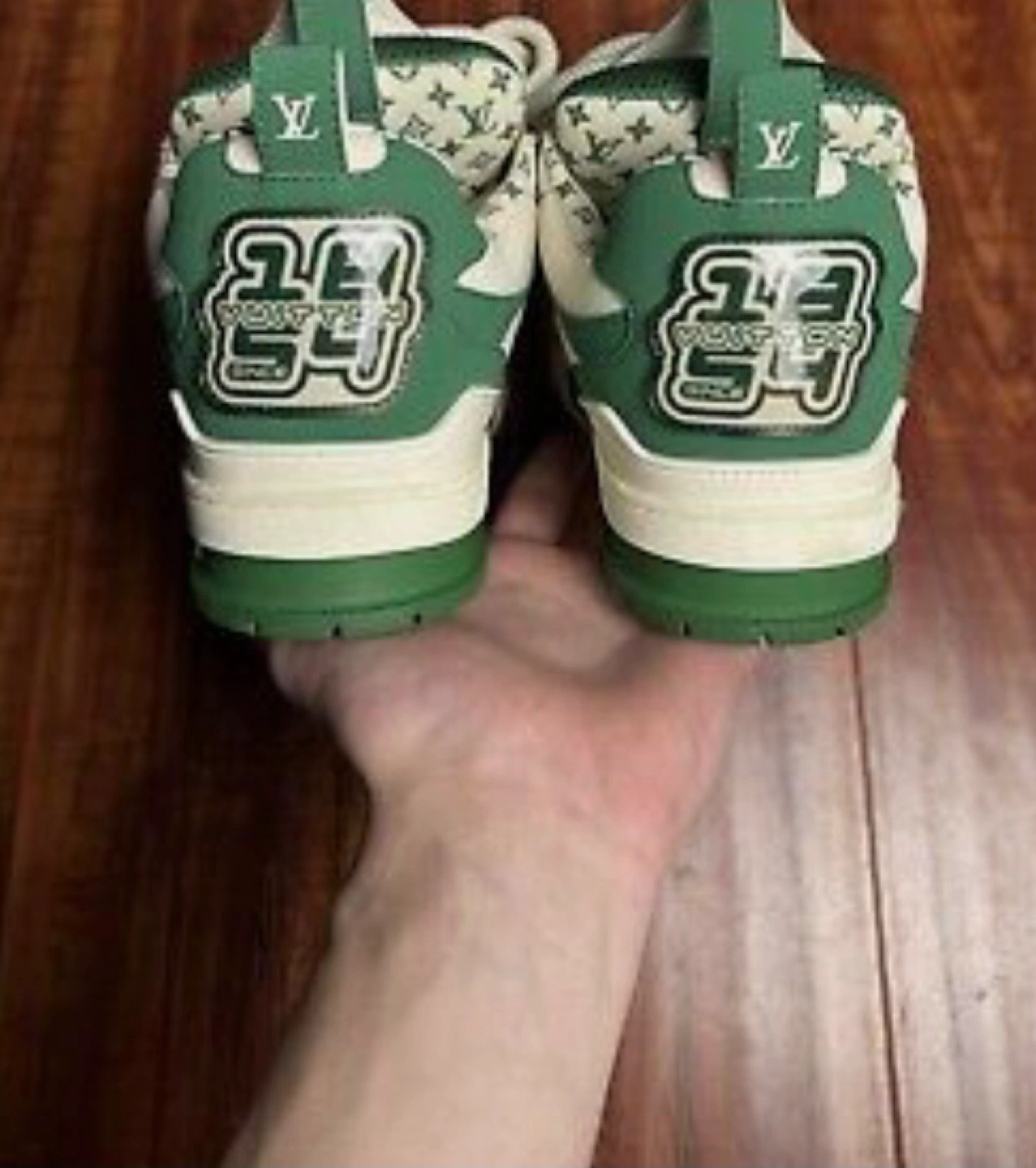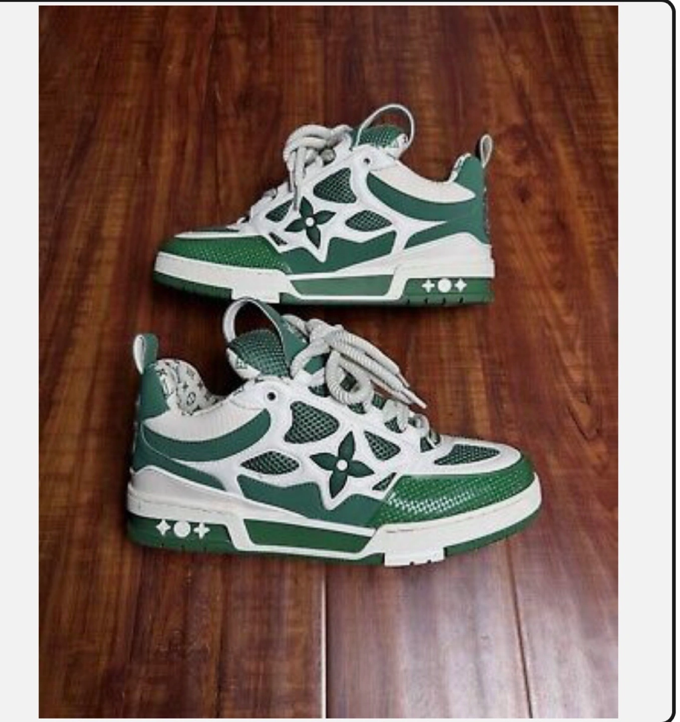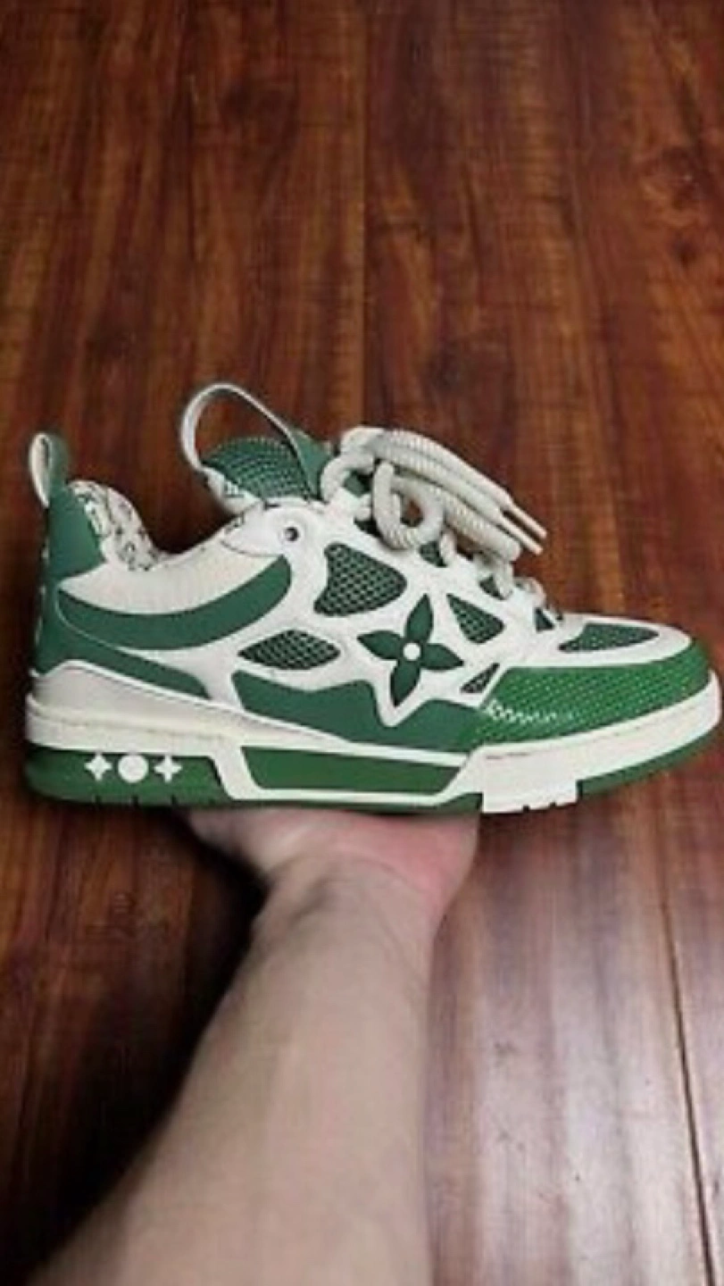 Men's low-top sneakers. Green and cream colorway. Features the iconic Louis Vuitton monogram. Lace-up closure. Stylish and comfortable. Great for everyday wear.