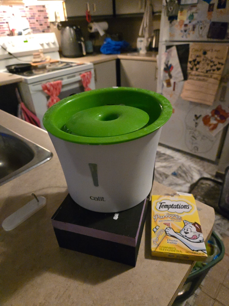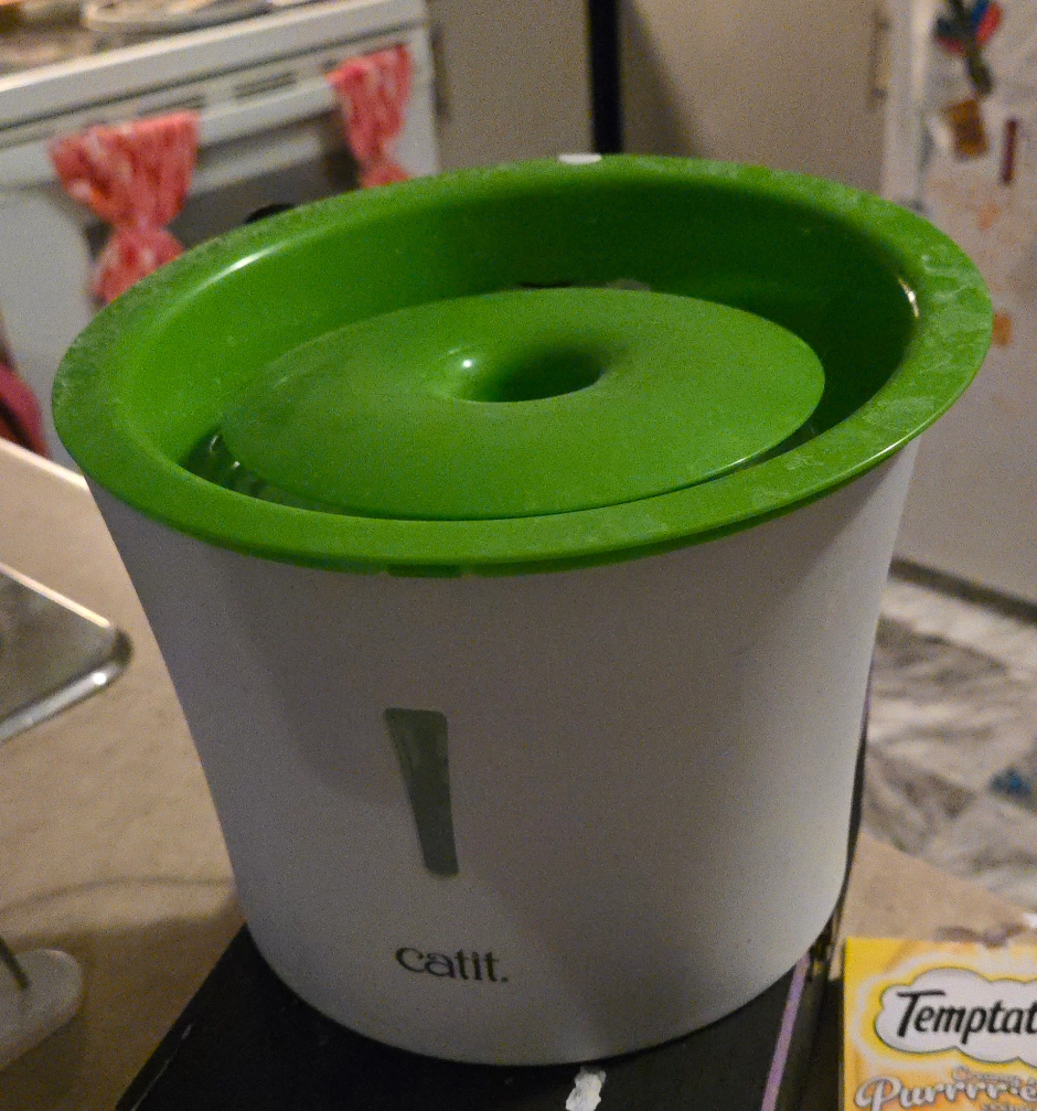 Used cat water fountain. Green top, white base. Good condition. cats didn't like it pick up only please