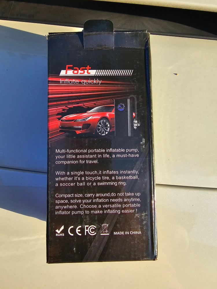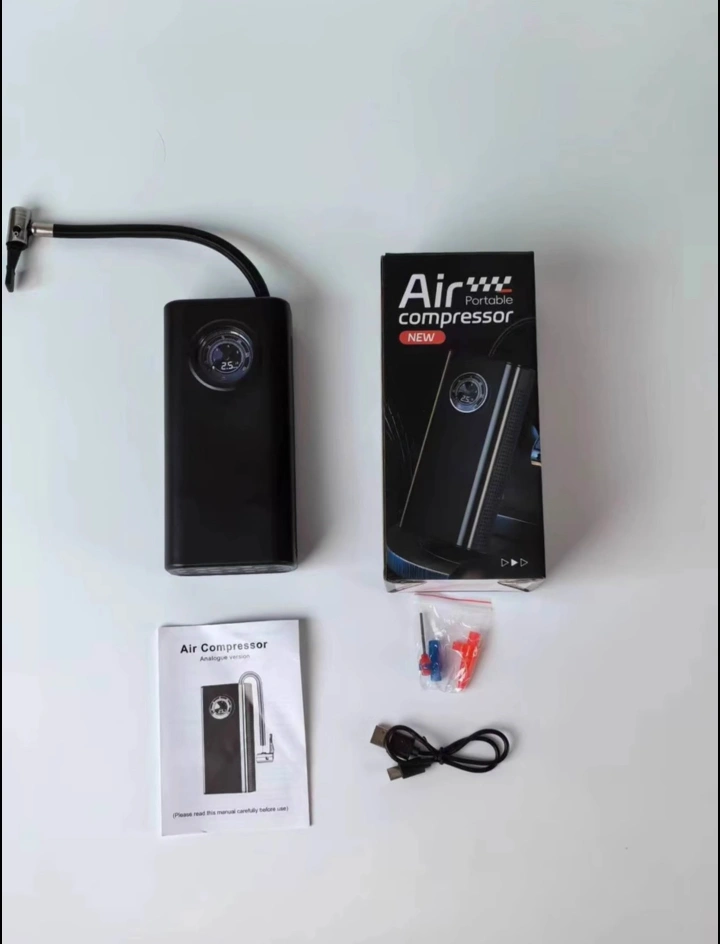 Brand New portable air compressor. Inflates quickly. Cordless, Portable, Compact size, easy to carry. Includes various nozzle attachments.