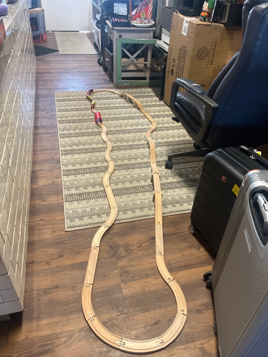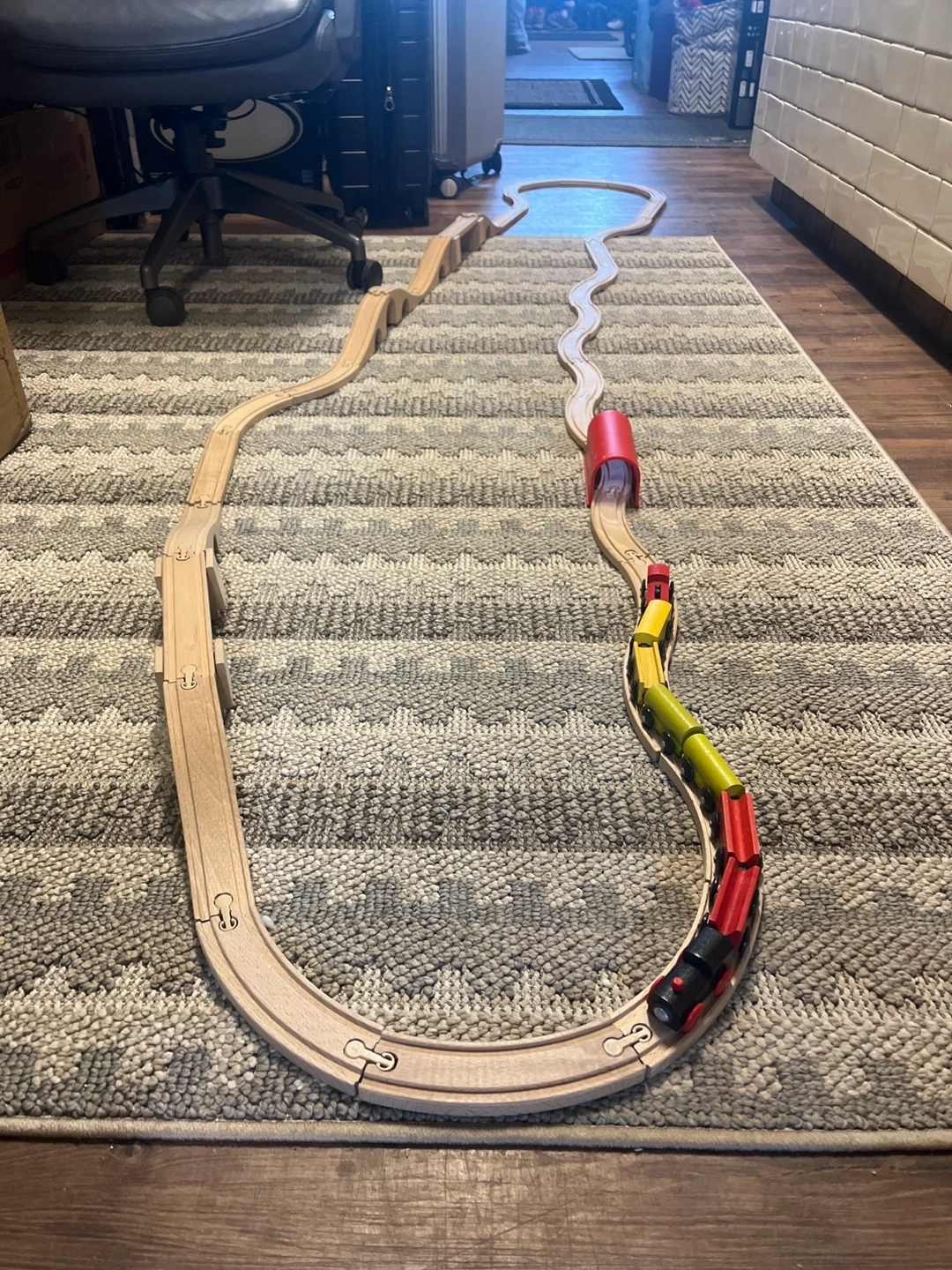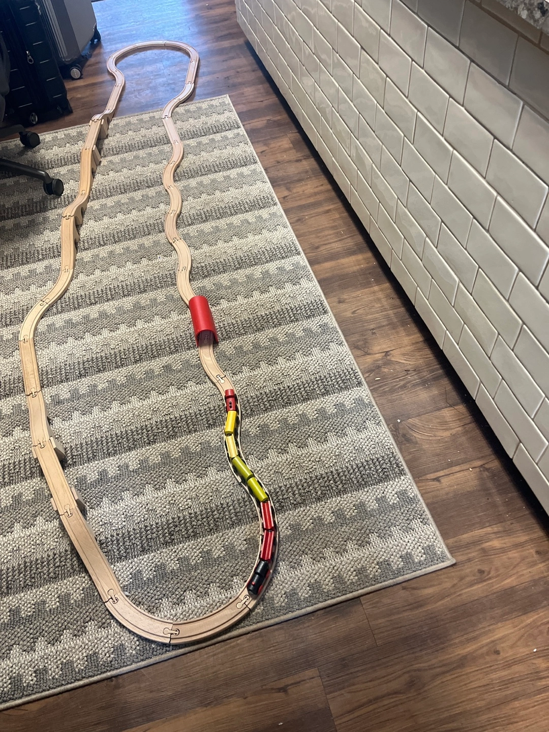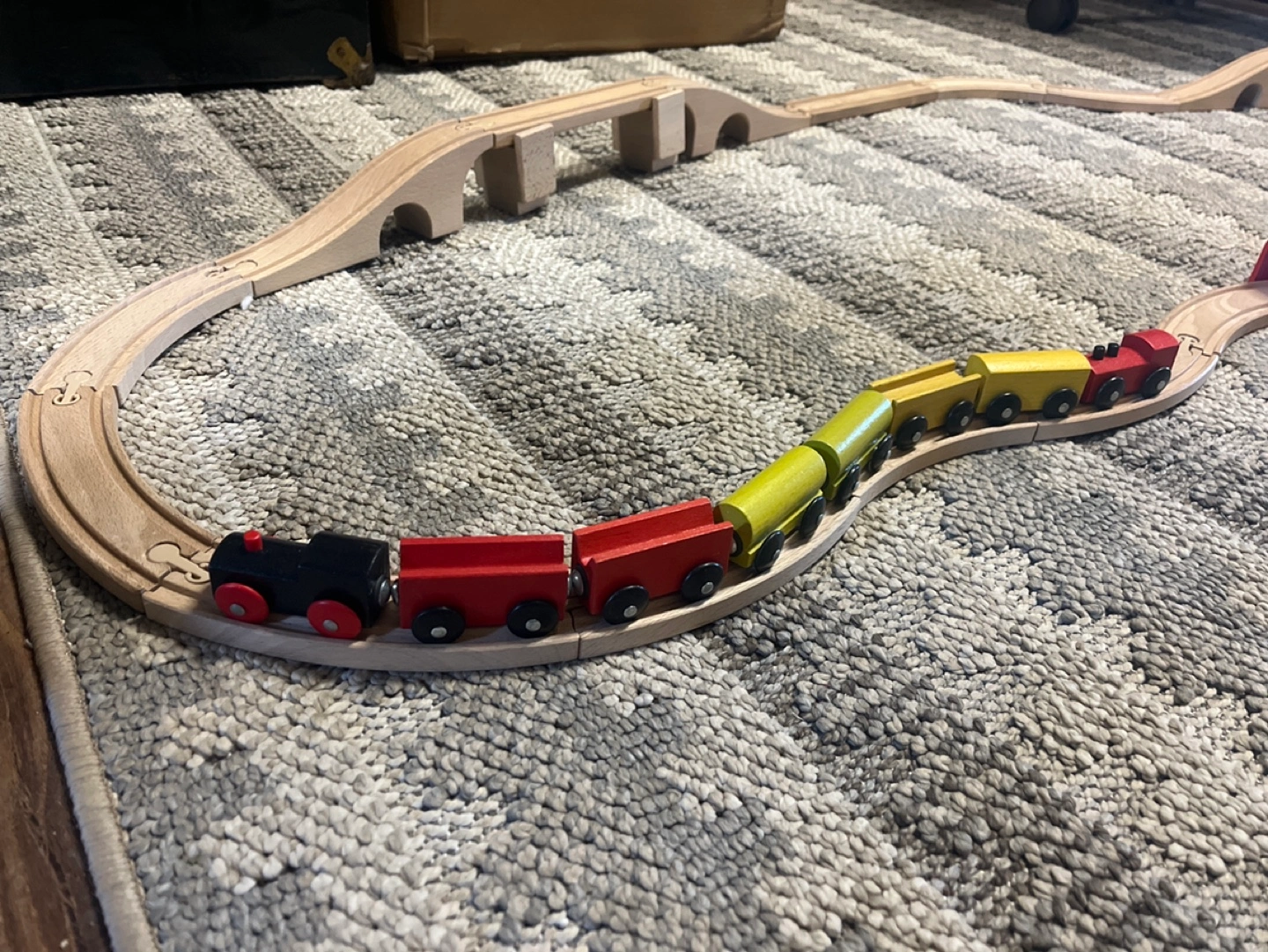 Large wooden train set. Includes multiple train cars, curved and straight tracks, a tunnel, and a bridge. Great for imaginative play.