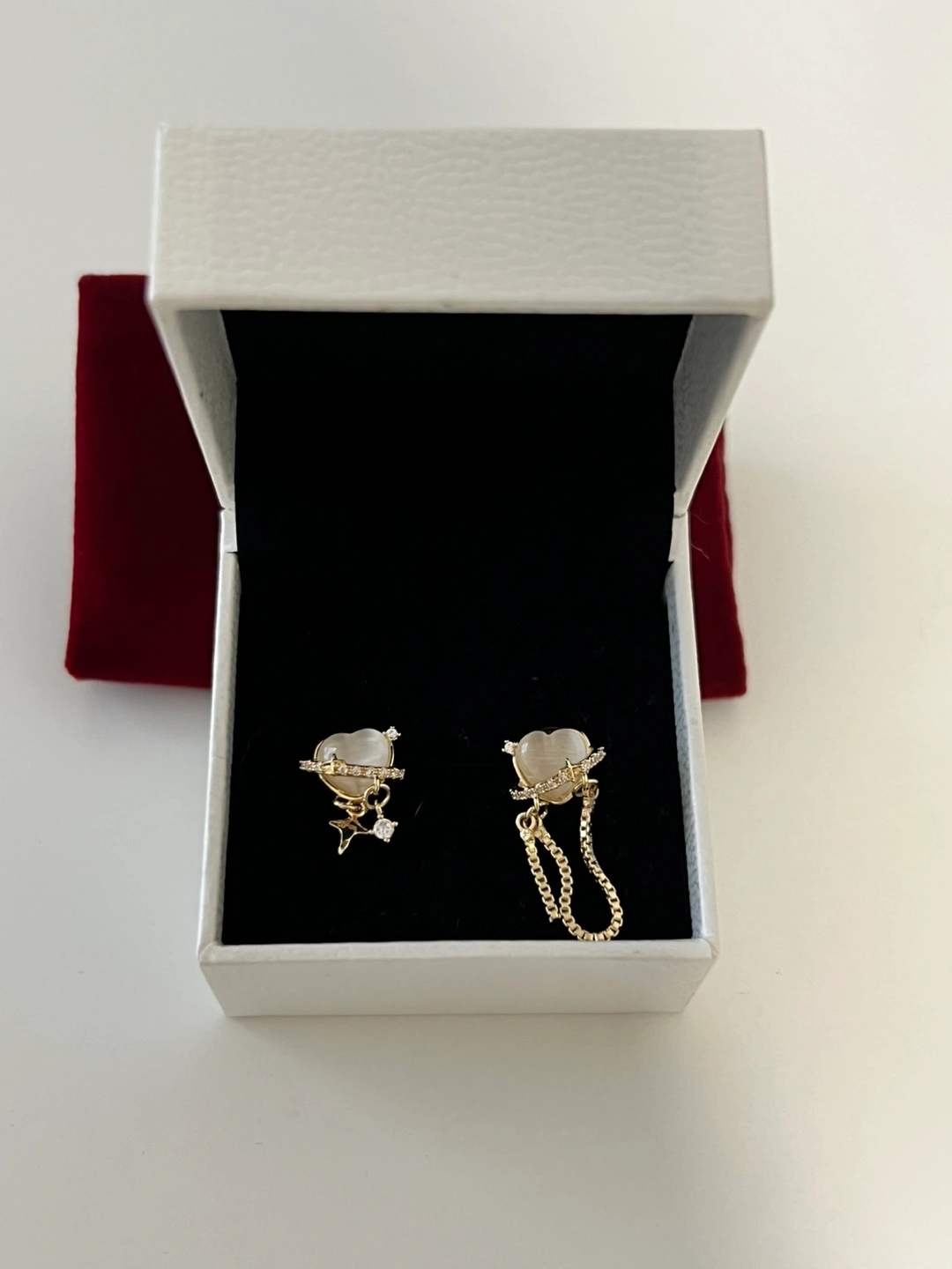 One earring features a dangling star charm, the other a delicate gold chain.