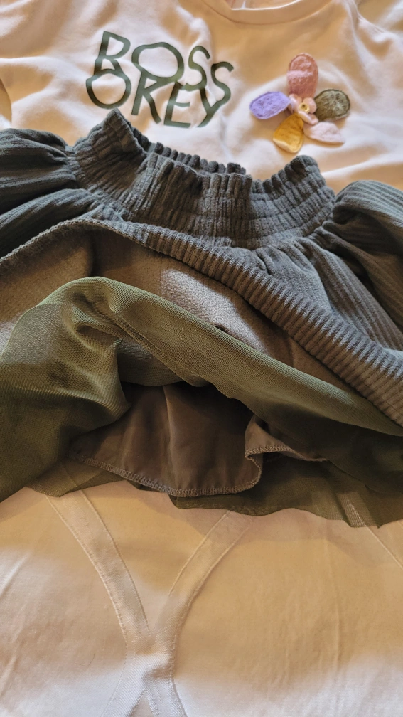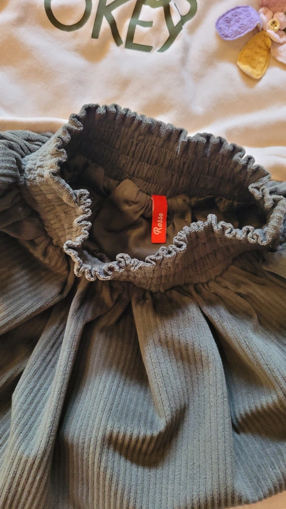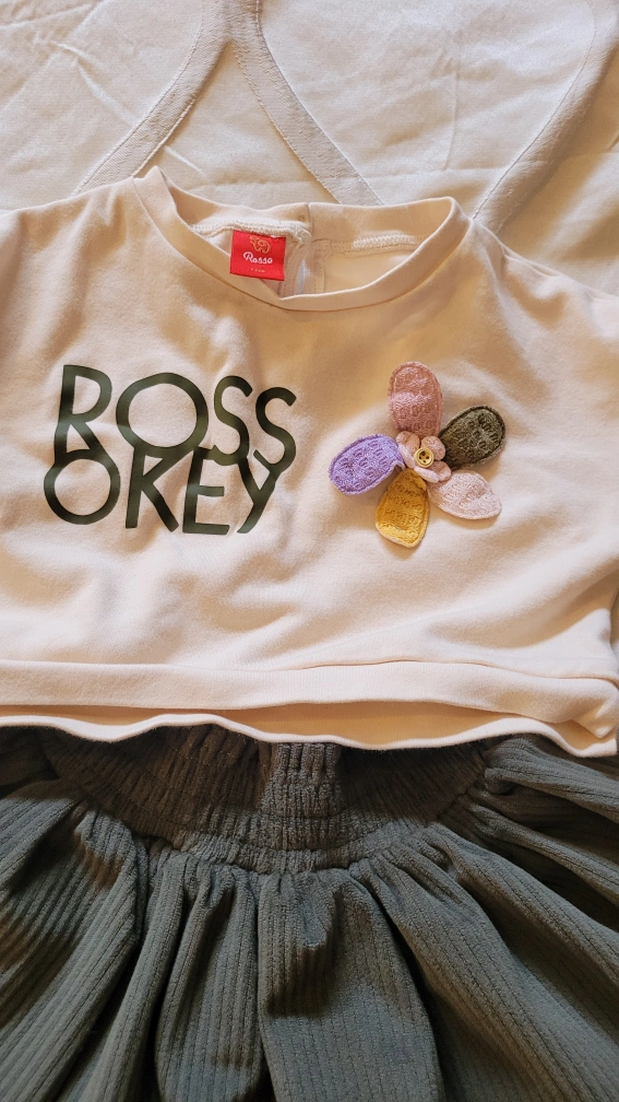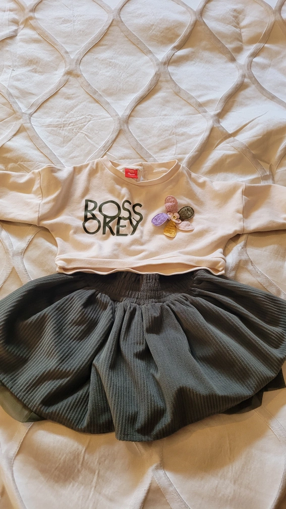 Adorable girls outfit. Olive green corduroy skirt with a gathered waist. Paired with a cream coloured cropped sweatshirt, Soft and comfortable material. Perfect for casual wear.