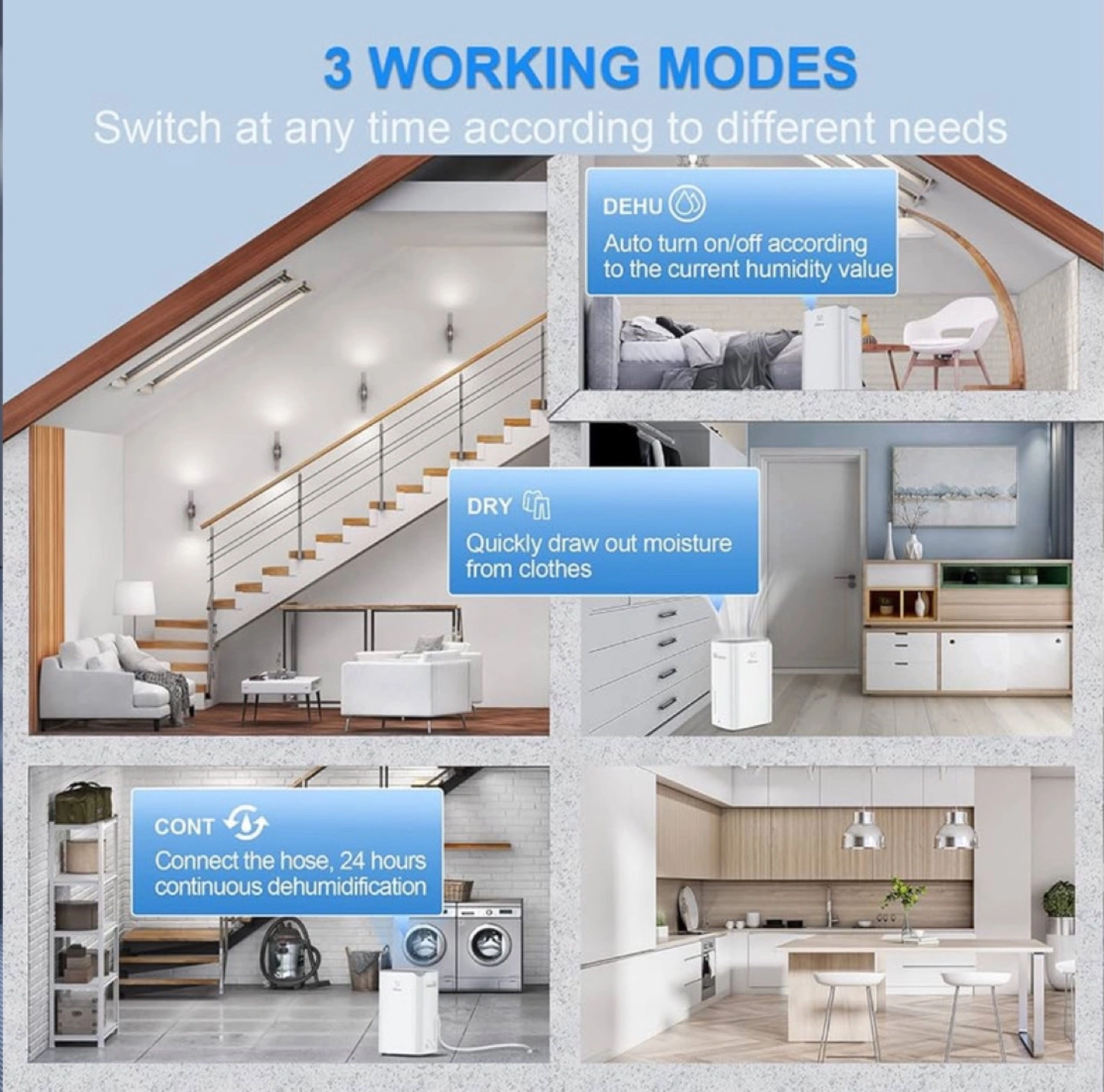 80 Pints Dehumidifier Covers Up to 4500 Sq. Ft of Space Birtsou 80 pint Dehumidifier is the perfect choice to maintain a healthy humidity range in large spaces up to 4500 sq. Ft. (Under 95 F 90%RH condition the max dehumidification capacity up to 100 pints) It s ideal for use in your home basement bedroom bathroom closet office garage kitchen laundry room storage room crawl space wine cellars restaurants and gyms etc. 3 Distinct Modes All designed to help you maintain a healthy comfortable environment. The DEHU mode is perfect for keeping your home at the optimal humidity level ideal for spaces with a clear need for humidity. The DRY mode is ideal for drying wet clothes quickly and efficiently. It works to quickly remove moisture and dampness leaving your clothes feeling soft and dry. The CONT mode is great for high humidity spaces so you can stay comfortable in even the most humid of environments. So Comforting Equipped with a built-in ultra-sensitive temperature humidity sensors and auto defrost you can be sure that it s always working efficiently and effectively. The 24H two-way timer ensures the dehumidifier is always running at the right time and the child lock keeps your little ones away from the controls. The noise level is as low as 40dB so you don t have to worry about any loud noises disrupting your home and also comes with overheat protection for added safety. Ingenuity Appearance Design Complete with ergonomic recessed handle four 360 invisible wheels make it easy to move and its compact size allows you to store it away when not in use. The front water level line allows you to easily monitor the water levels in the tank while the digital humidity display keeps you informed of the ideal humidity levels for your space. The removable and re-washable air filter ensures that you always keep the air in your home clean and fresh. Auto Drainage We provide an additional 3.28 feet (1m) of drain hose simply connect it to the outlet and remove the water plug for continuous drainage without having to manually empty the tank. This hassle-free feature makes it easy to keep the air in your home clear and dry all the time.