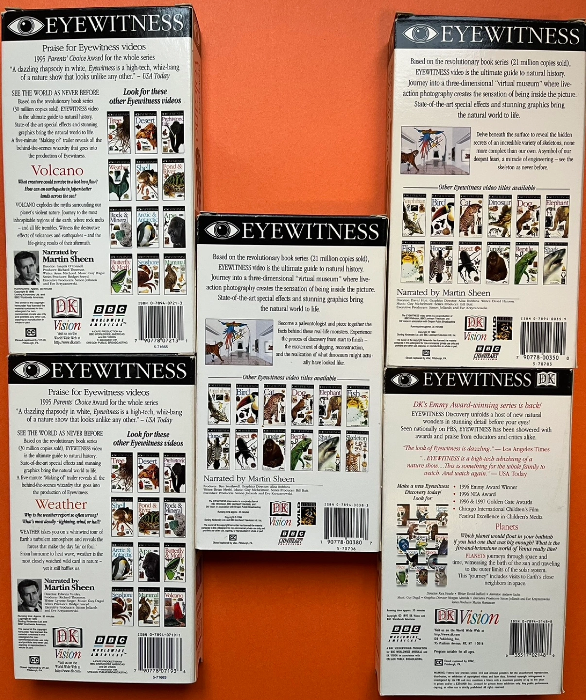 Set of five Eyewitness VHS tapes. Titles include Volcano, Dinosaur, Skeleton, Planets and Weather. Narrated by Martin Sheen. Excellent condition. Educational and informative.
