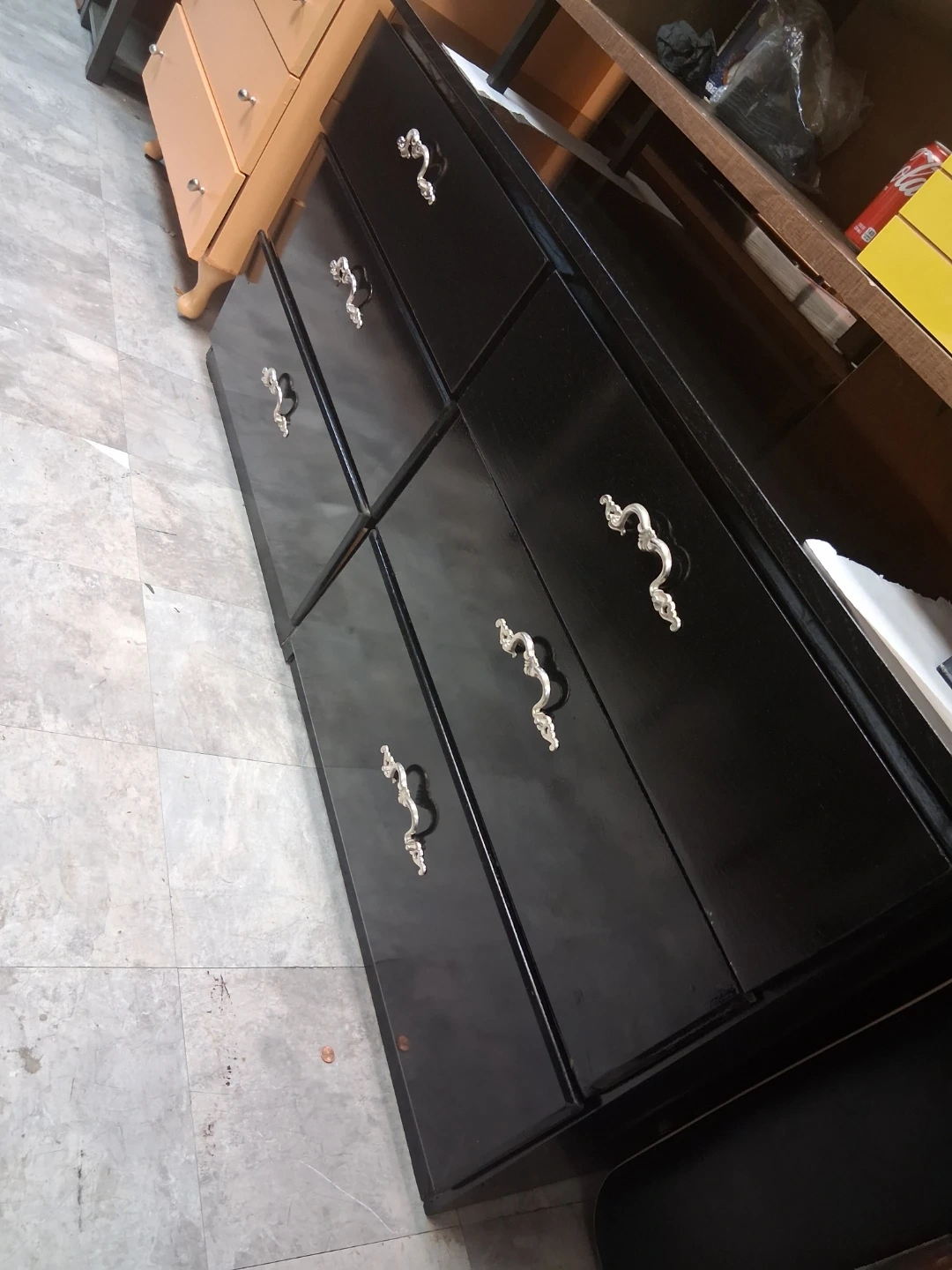 Six-drawer black dresser with ornate silver hardware. It's a good size for storing clothes and linens. This dresser would be useful for a bedroom or closet.