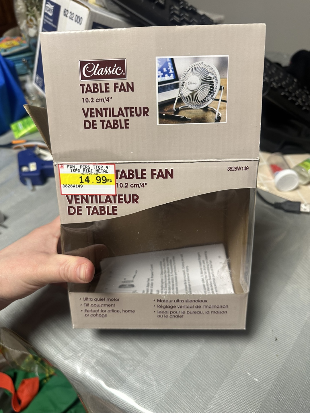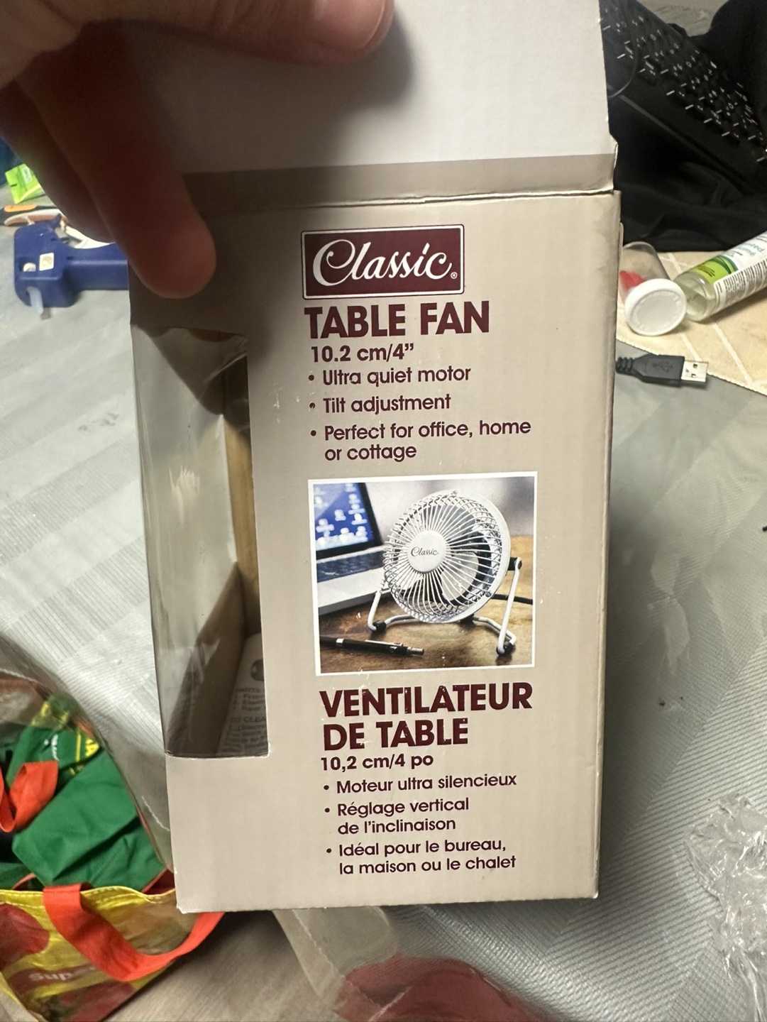 1 / 51 / 5Buy & SellClassic 10.2 cm/4" Table Fan - BlackClassic 10.2 cm/4" Table Fan - Black$15Small black table fan. Ultra quiet motor. Tilt adjustment. Perfect for office, home or cottage. Includes foldable stand.ConditionNewBrandClassicWHERE TO MEETCheck LocationView MapSELLERverifiedCrystalCummings1195 reviews0 chats·0 favorites·8 viewsSEND CHAT TO SELLERHi Crystal! I’m interested in your listing.Hi Crystal! I’m interested in your listing.Get the Karrot app to chatSign In to chat