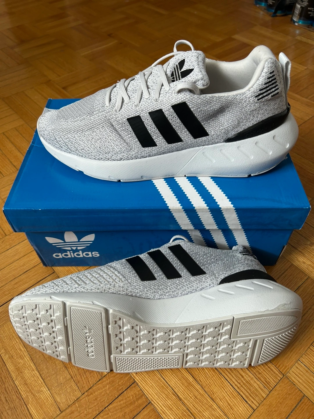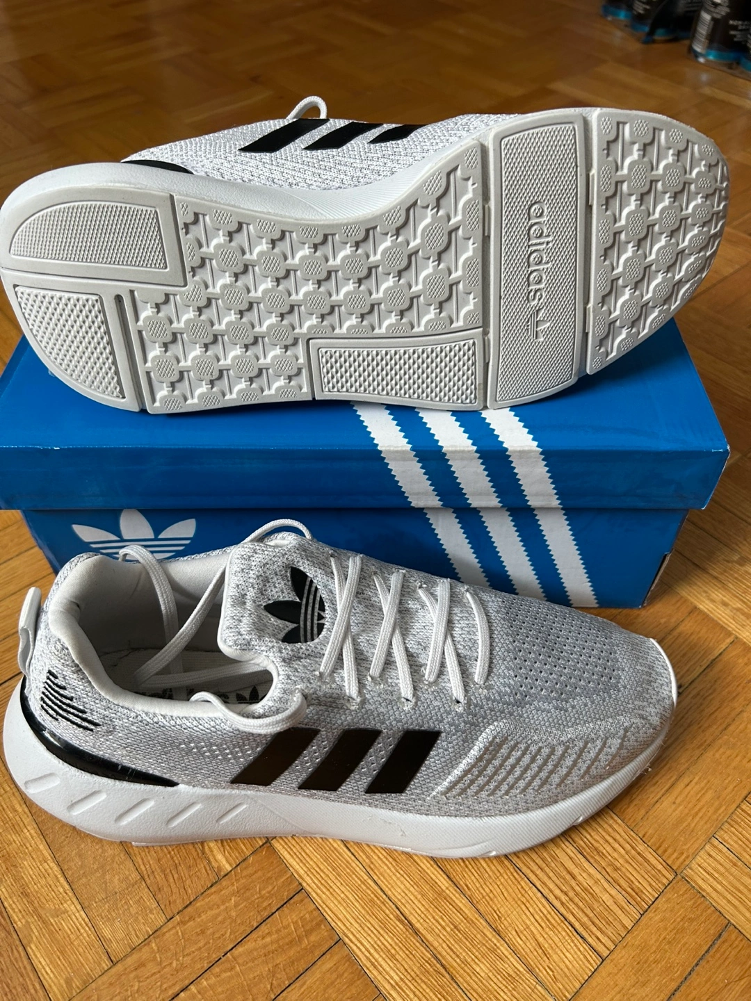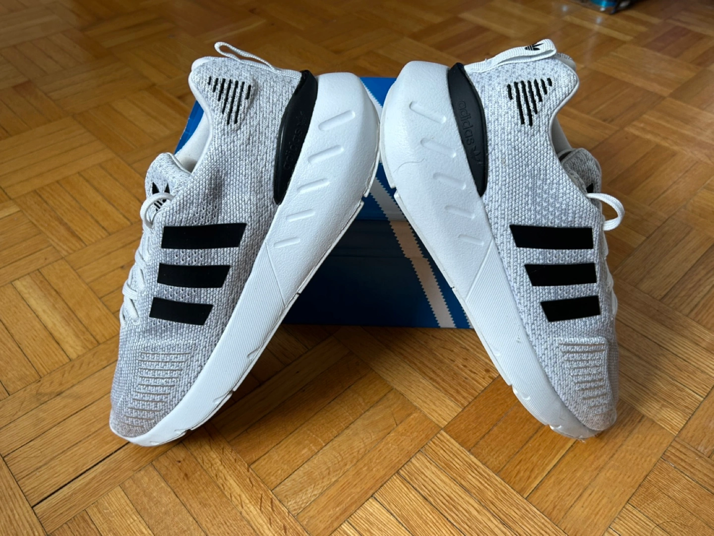 Ladies adidas Grey and white running shoes. Worn once by my wife, but she doest wear them anymore. Comes with original box. there Comfortable and stylish. Excellent for everyday wear or workouts. From a petgree and smoke free home.