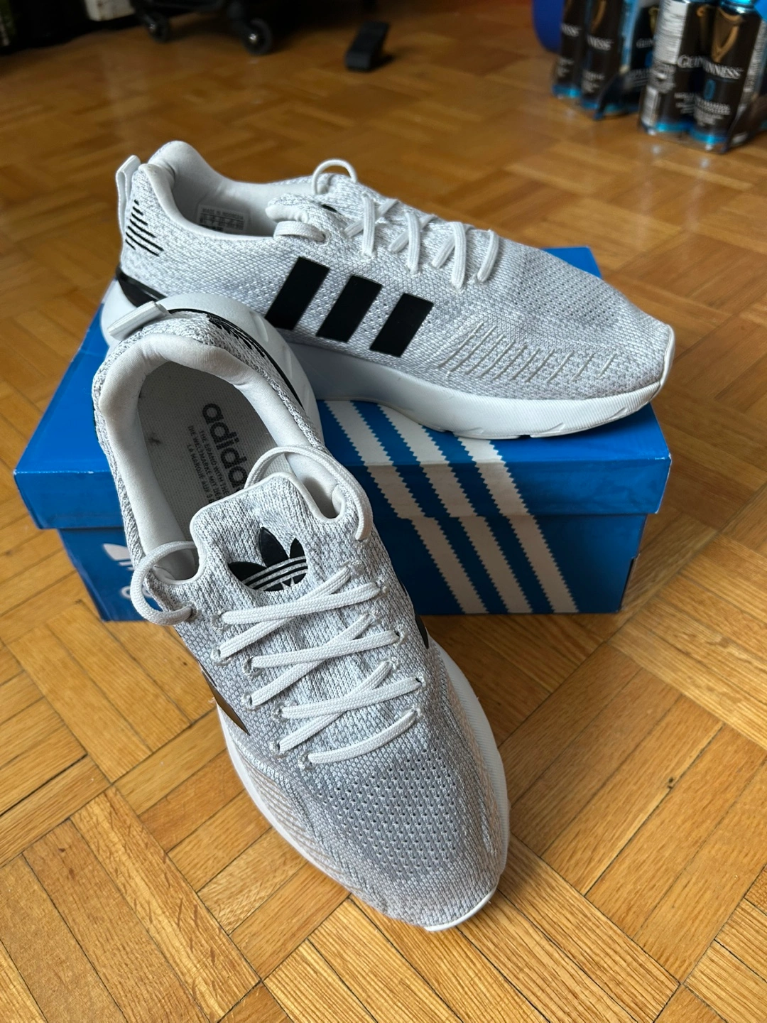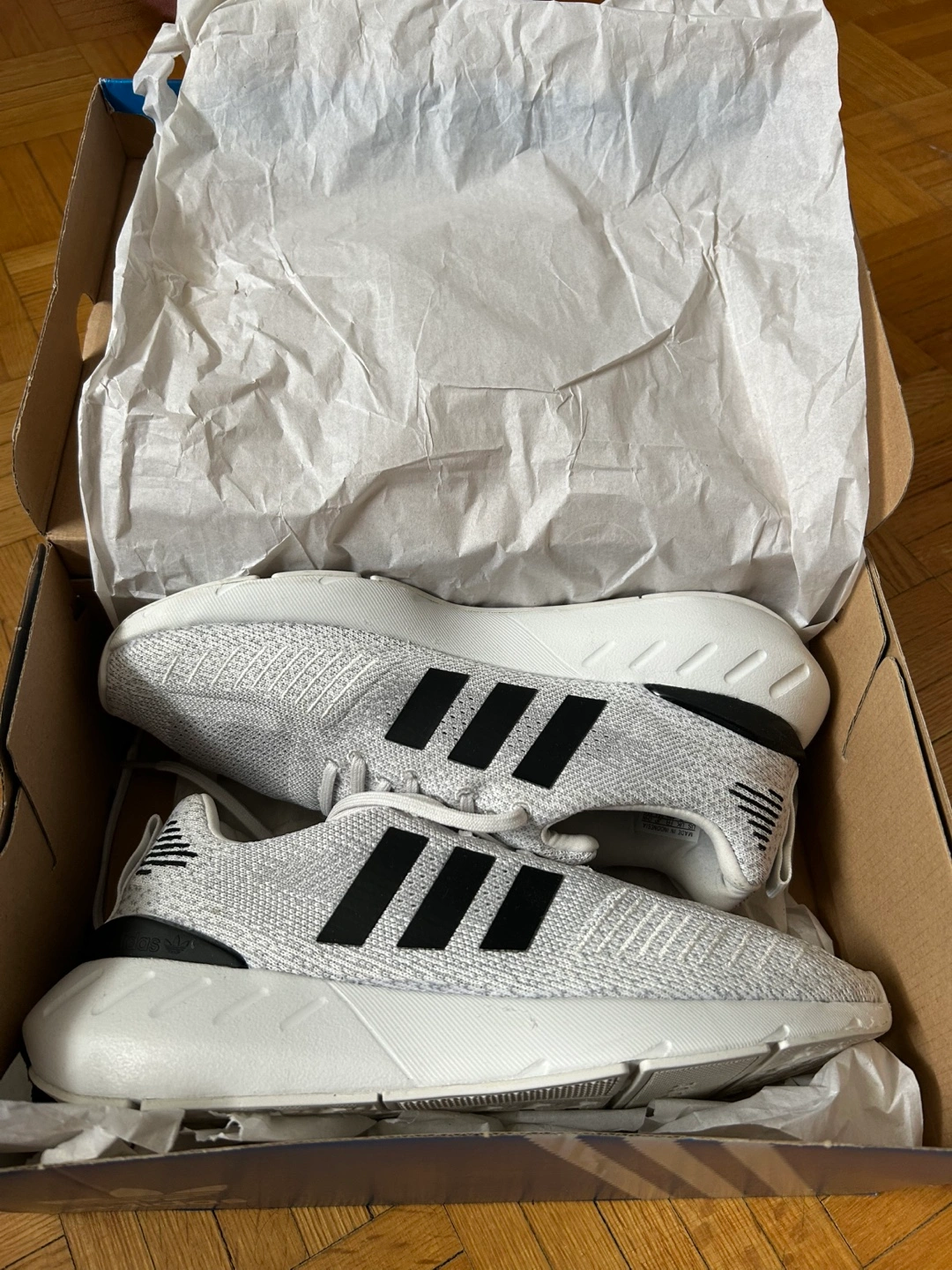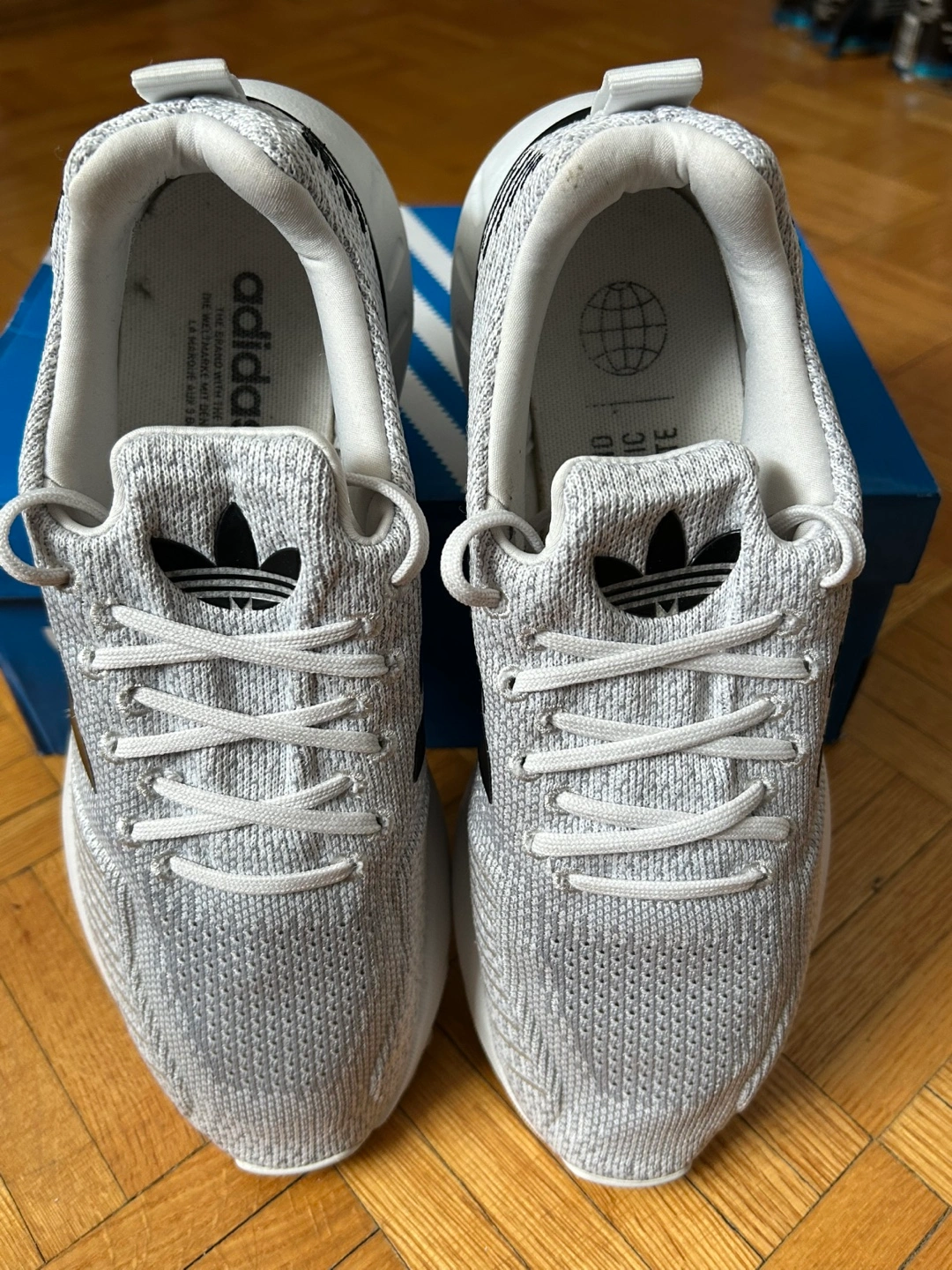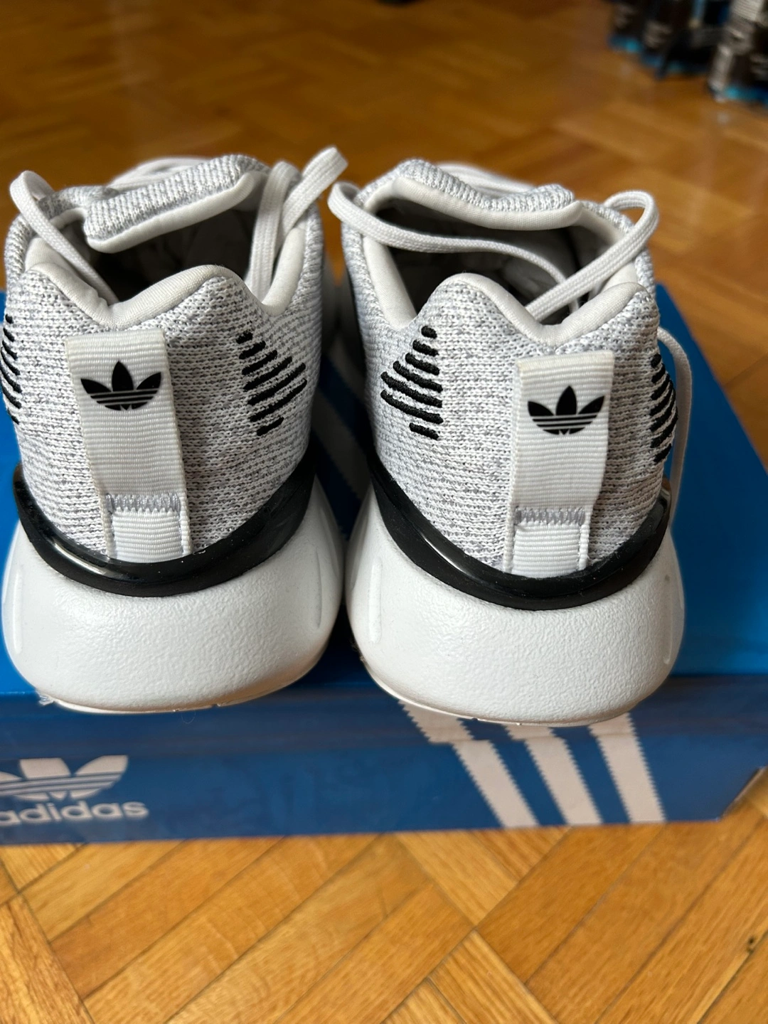 Ladies adidas Grey and white running shoes. Worn once by my wife, but she doest wear them anymore. Comes with original box. there Comfortable and stylish. Excellent for everyday wear or workouts. From a petgree and smoke free home.