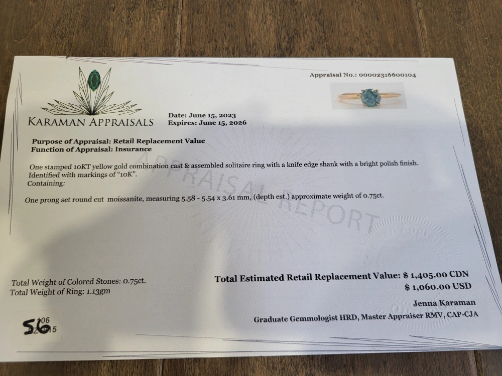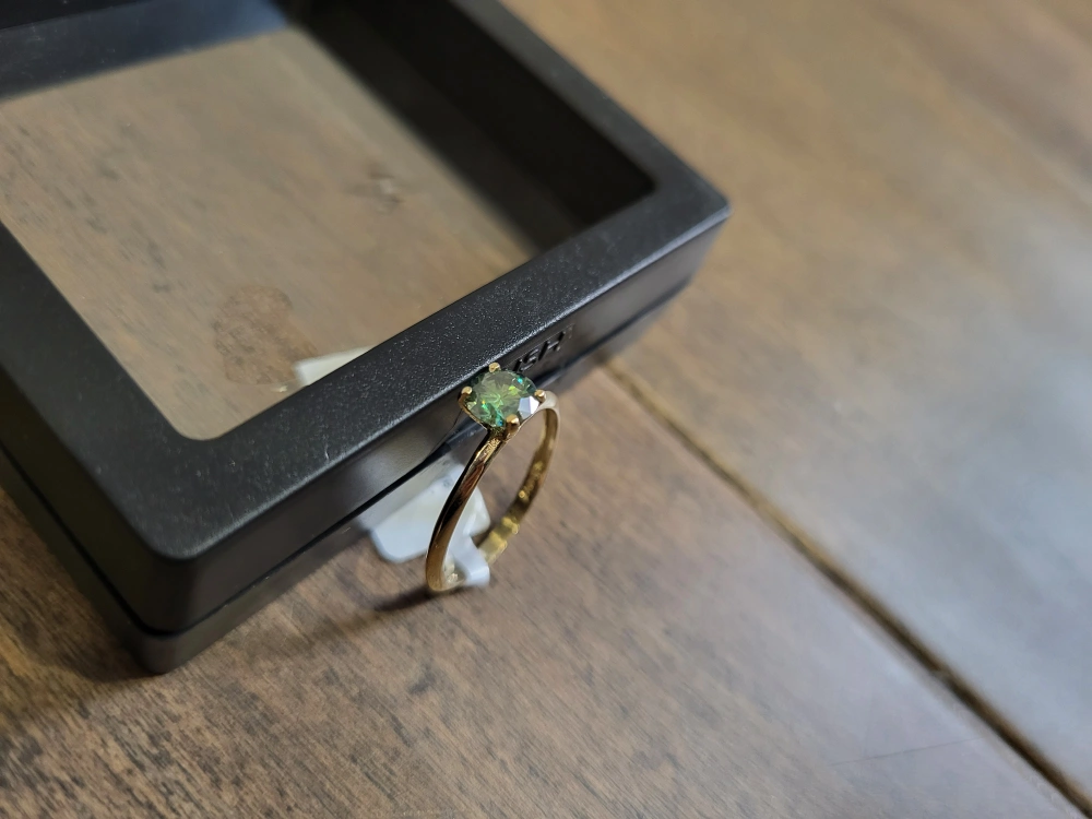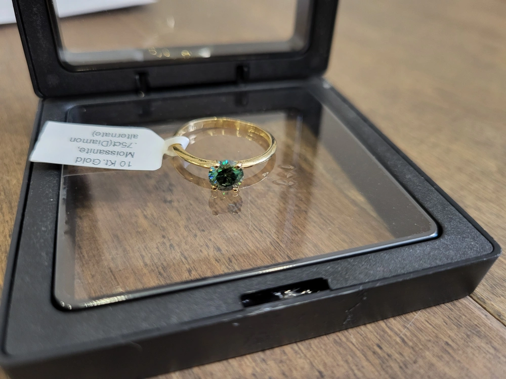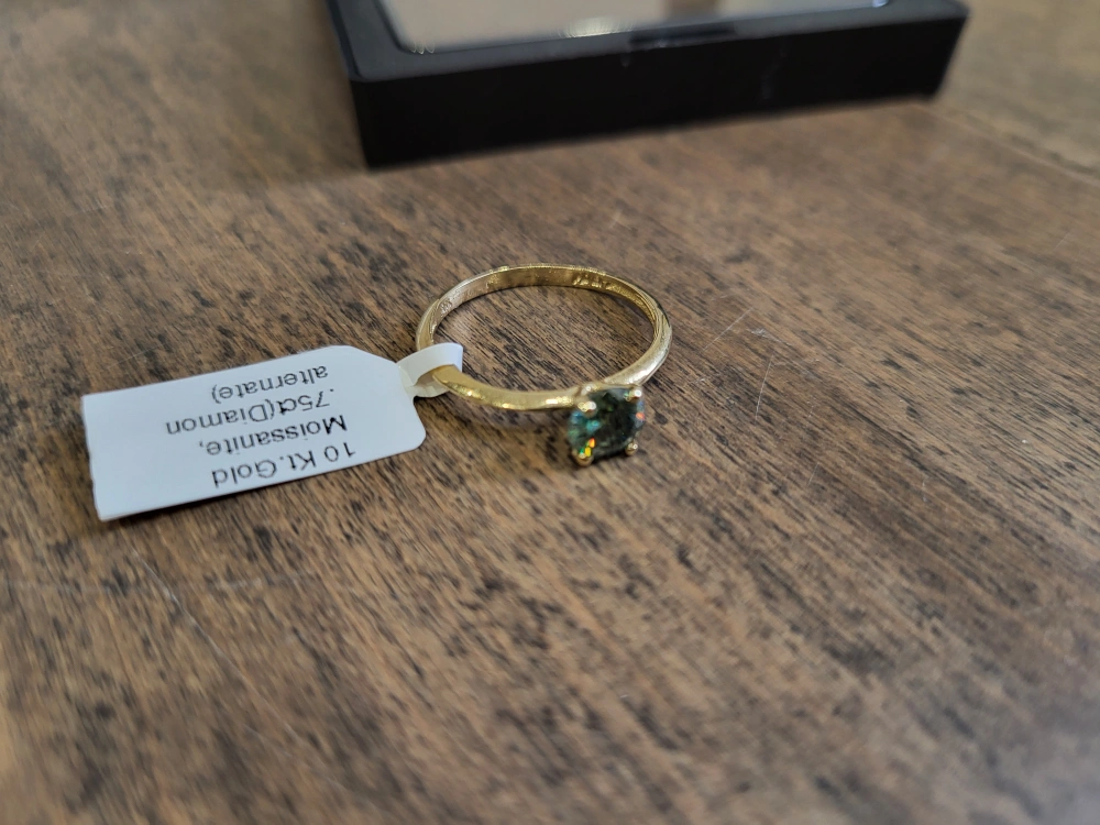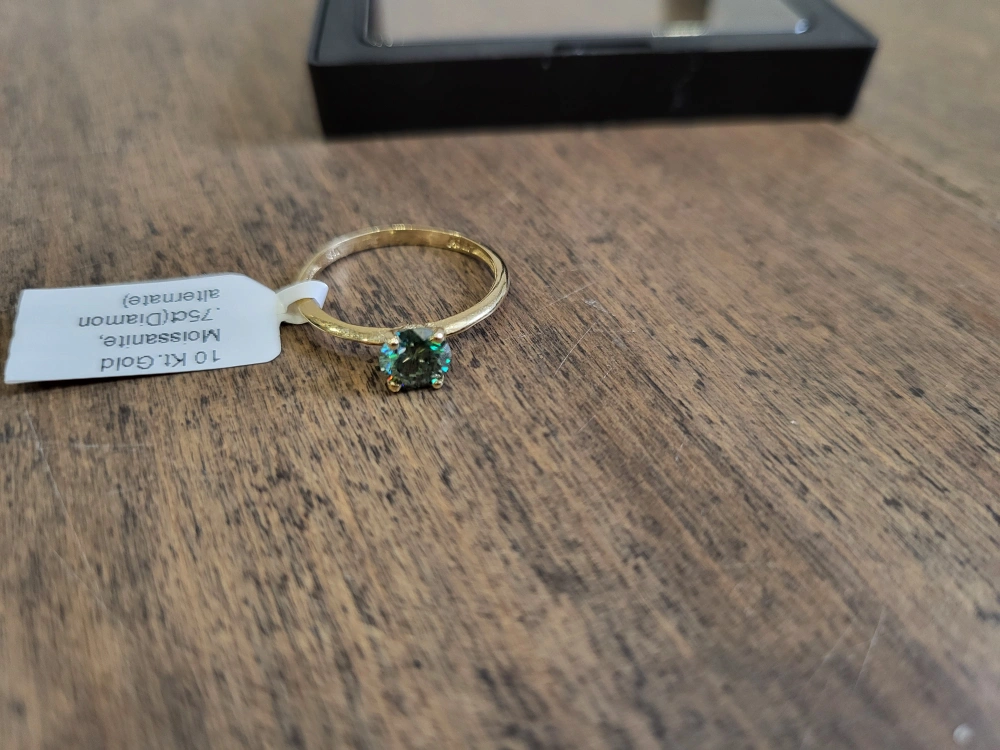 Beautiful 10 karat yellow gold ring. Features a green diamond moissanite stone. Size 7.5. made in Canada, 0.75ct carats stone, comes with appraisal.