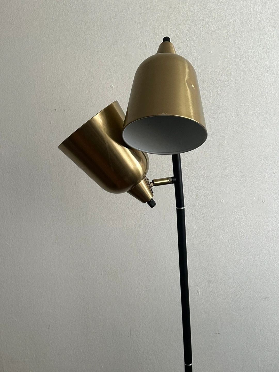 Adjustable double-headed floor lamp. Gold-tone shades and black pole. Great for reading or ambient lighting.