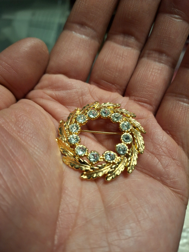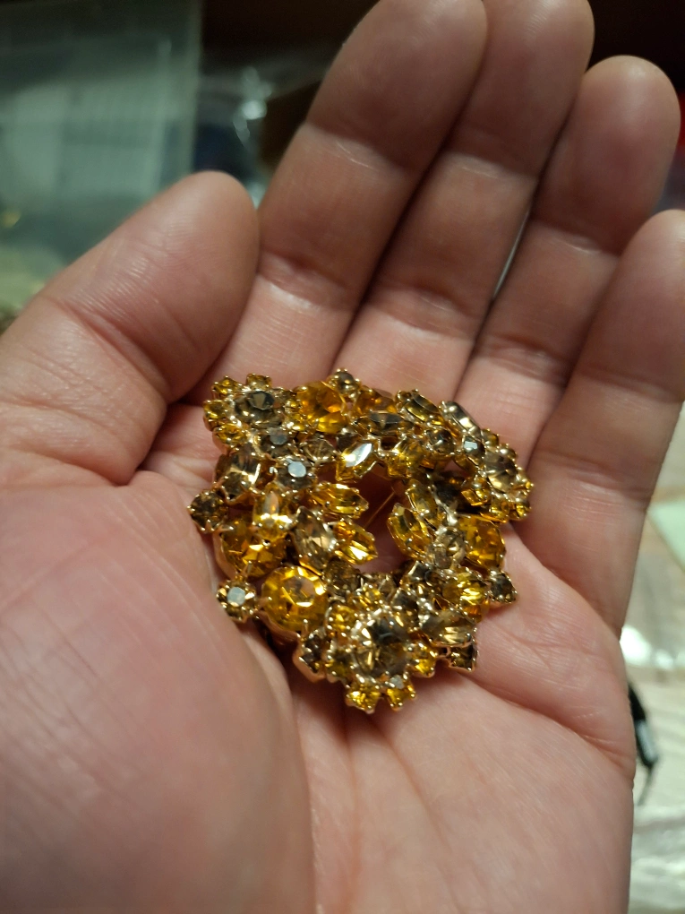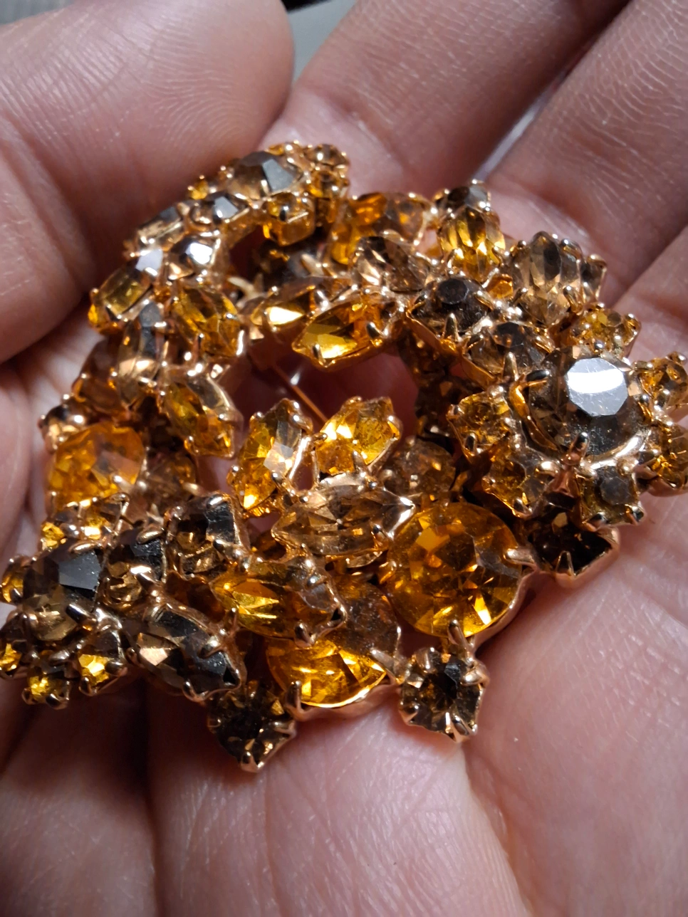Four beautiful vintage brooches. Gold-toned metal. Various colours and styles. Rhinestone accents. Perfect for adding a touch of sparkle to your outfit.