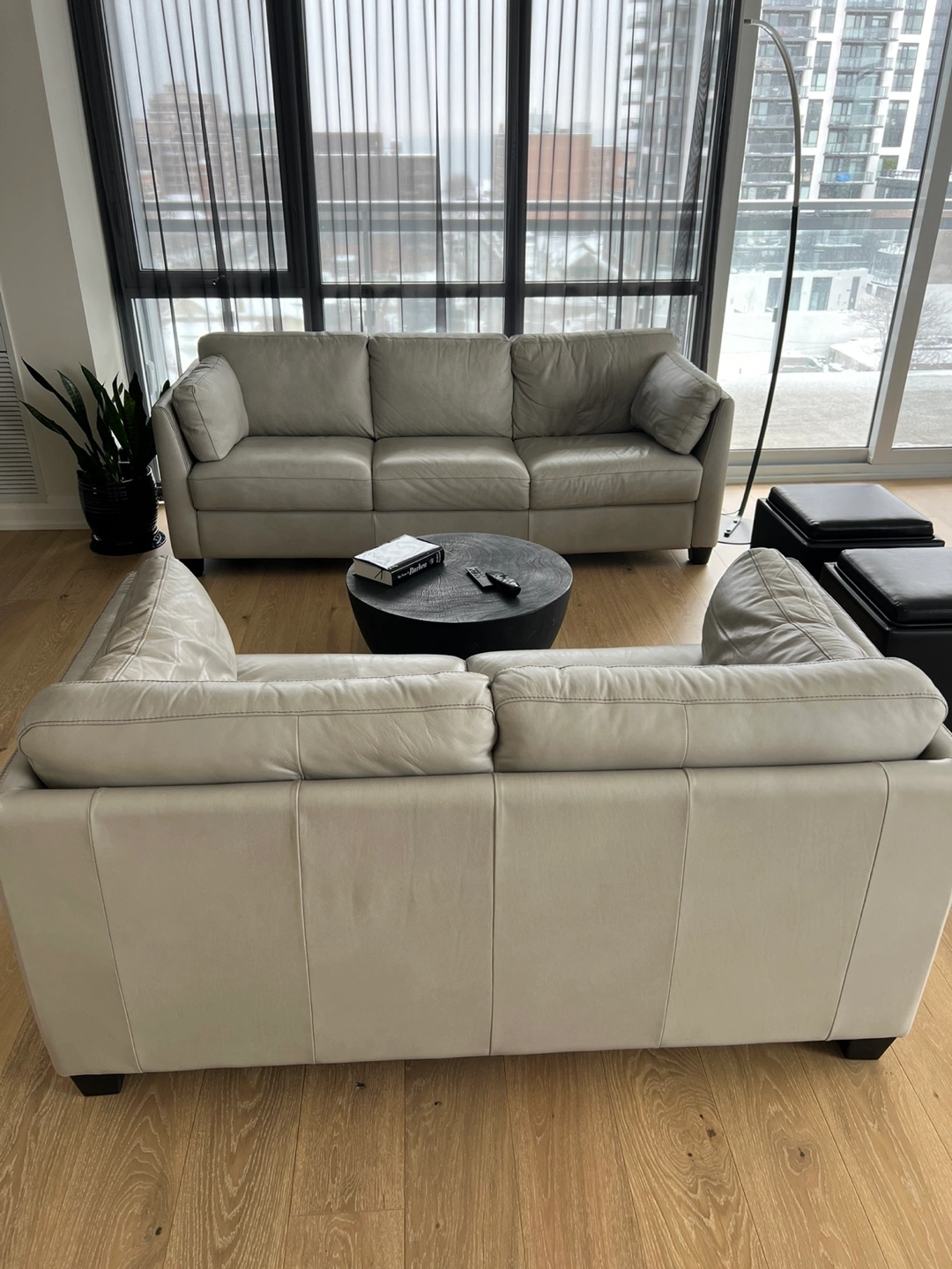 Beautiful light grey leather sofa set. Includes a loveseat and a large sofa. Modern design. Excellent condition. Comfortable and stylish. Italian leather 2 seater and 3 seater . Best offer