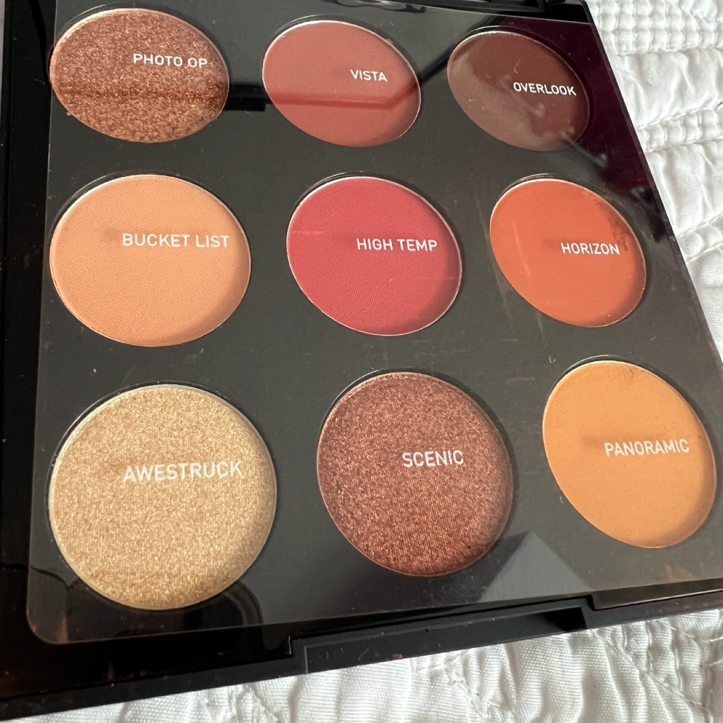 Nine-pan eyeshadow palette. Warm-toned shades. Scratches on packaging. Pre-owned. No box, but unused.