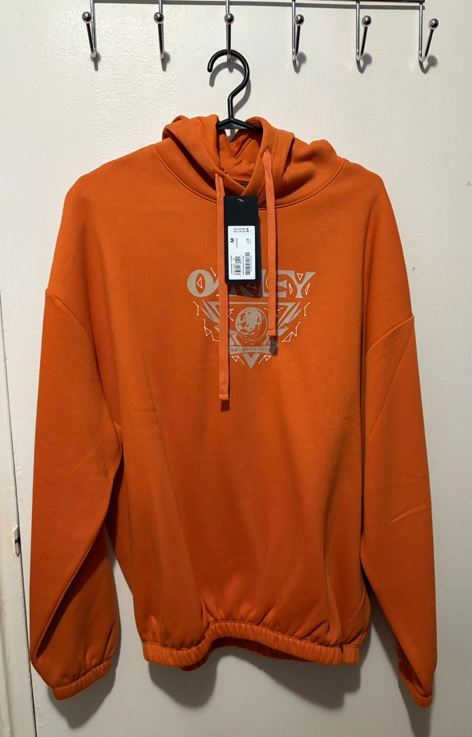 Men's size medium , Oakley hoodie- Burnt Orange .Features a unique graphic design with the Oakley logo and "Seventy-Five" text. Drawstring hood and ribbed cuffs. New with tags.