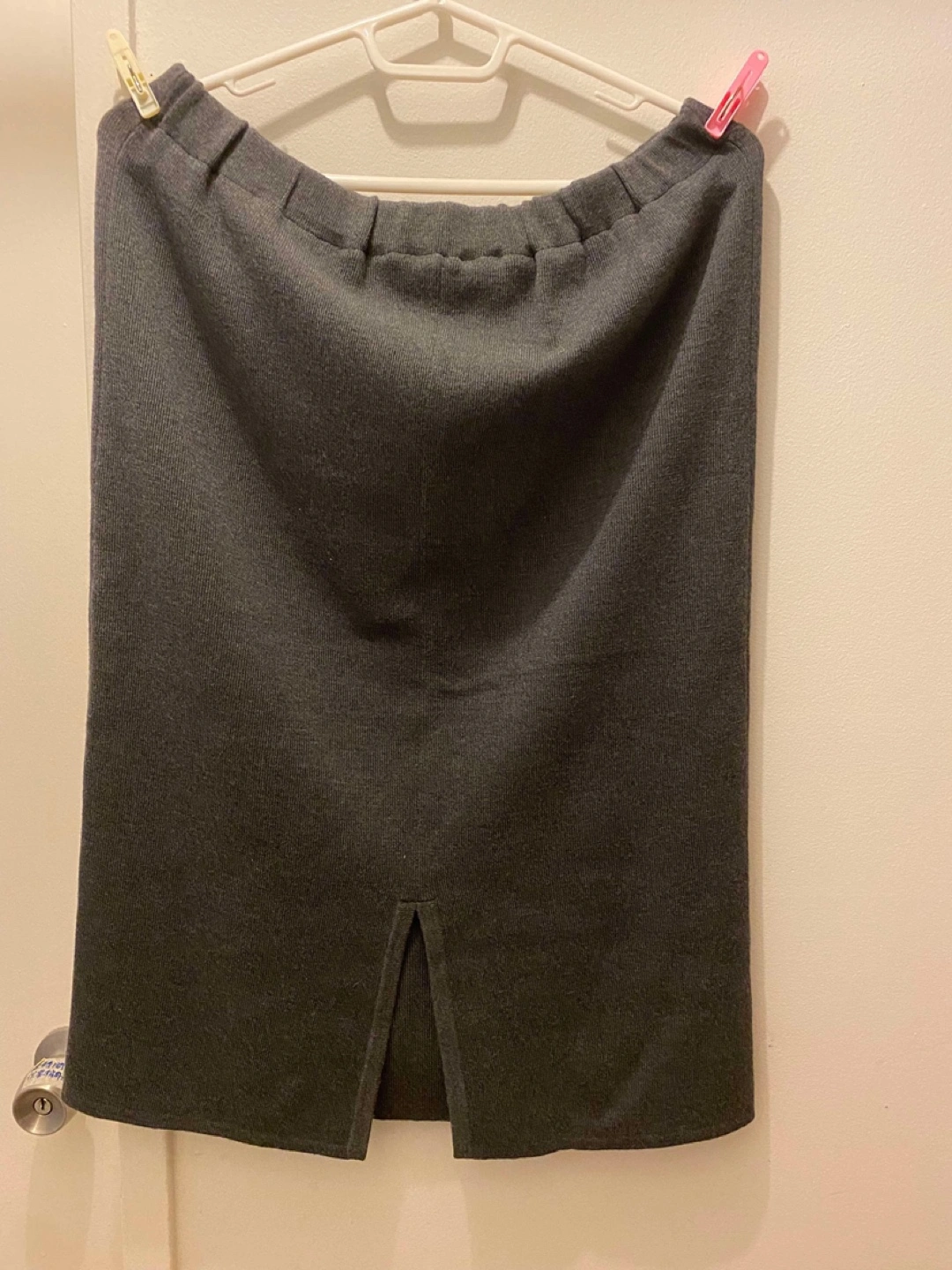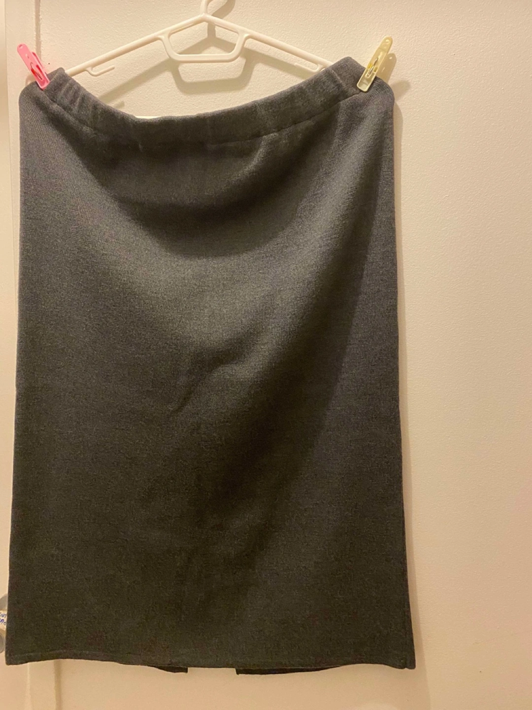 Women's dark grey midi skirt. Knit fabric. Elastic waistband. Features a side slit. Good for casual or business casual wear.