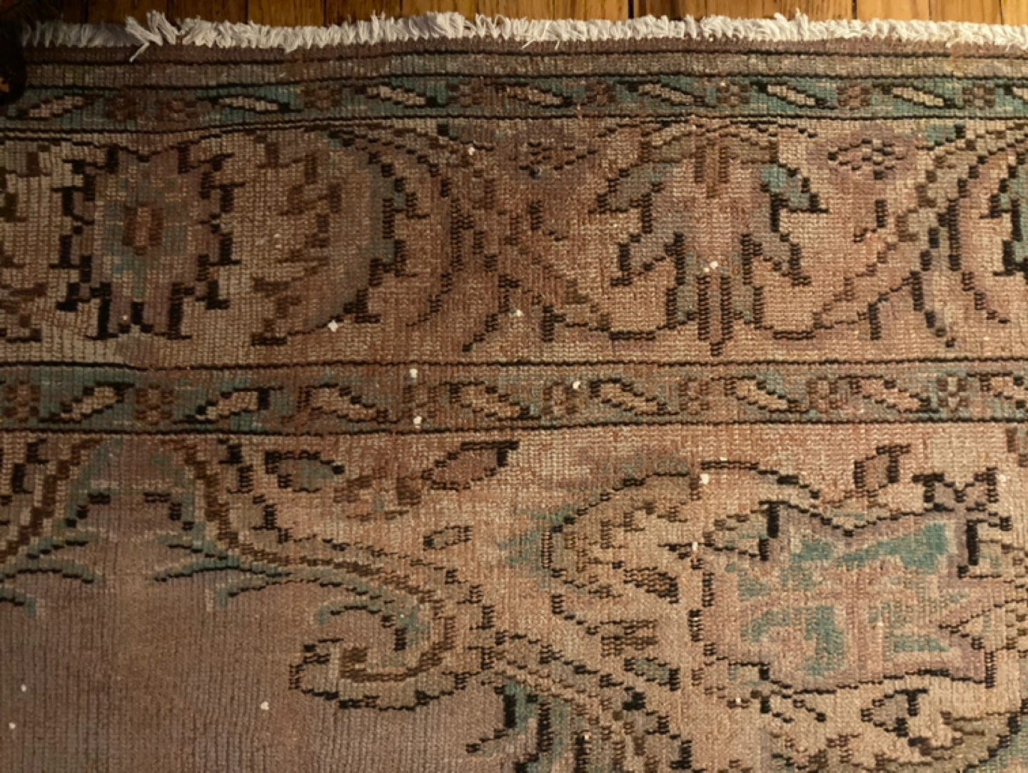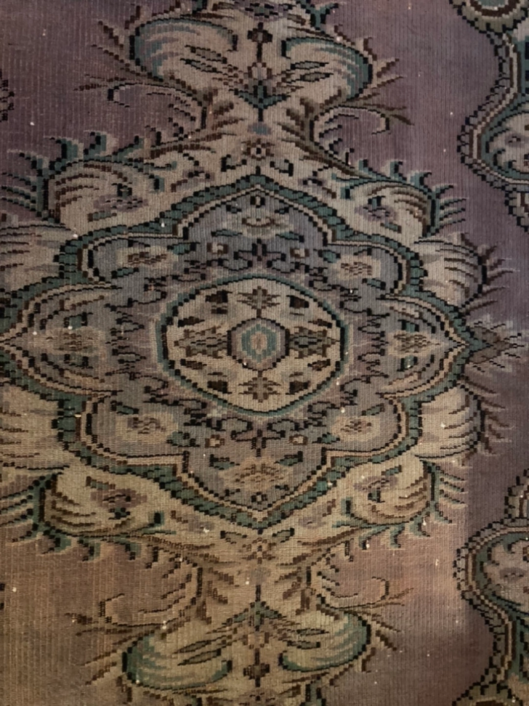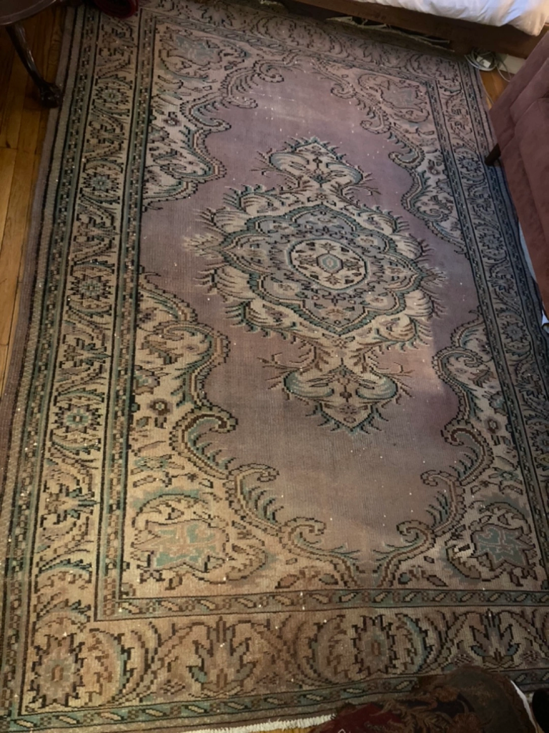 Vintage handmade area rug from Turkey (1950s made according to original owner) measuring 9'3" by 6'1". Mainly faded purple, turquoise green/blue, brown/burgundy and tan accents in design. General wear consistent with age, some fading at ends shown in photos. Small white fringe on short ends. Just purchased for $200 but appeared more brown in online photos (shown at end.) Seems generally clean, was vacuumed when I recieved it. From pet/smoke free home. Feel free to message with any questions.
