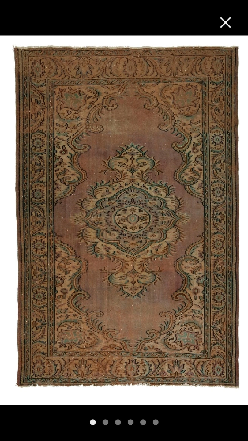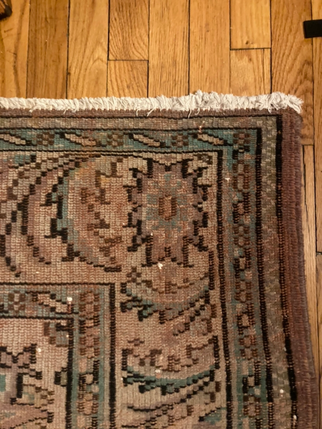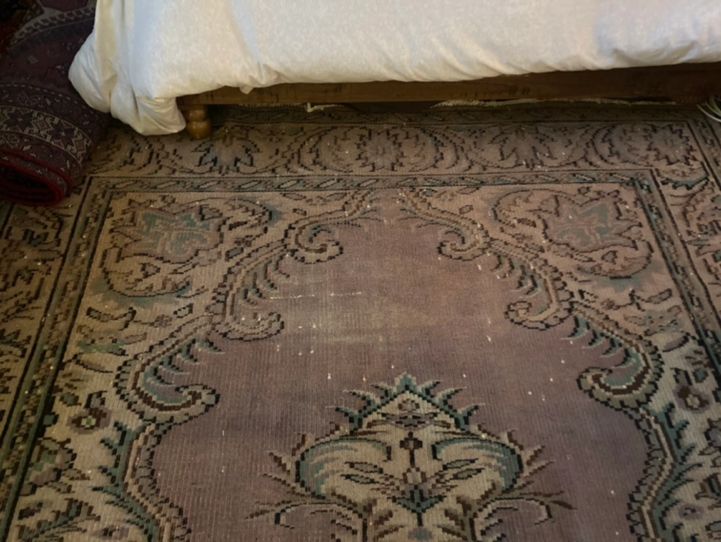 Vintage handmade area rug from Turkey (1950s made according to original owner) measuring 9'3" by 6'1". Mainly faded purple, turquoise green/blue, brown/burgundy and tan accents in design. General wear consistent with age, some fading at ends shown in photos. Small white fringe on short ends. Just purchased for $200 but appeared more brown in online photos (shown at end.) Seems generally clean, was vacuumed when I recieved it. From pet/smoke free home. Feel free to message with any questions.