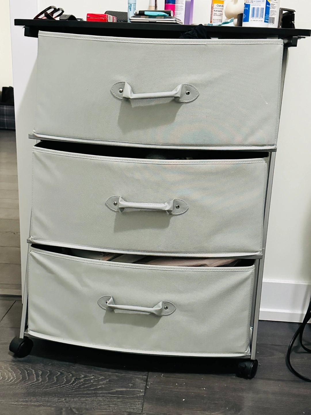 Portable organizer storage unit. Three fabric drawers with wood top and metal frame with wheels for easy mobility. Great for organizing small items. Few months old in very good condition. Available for pick up.