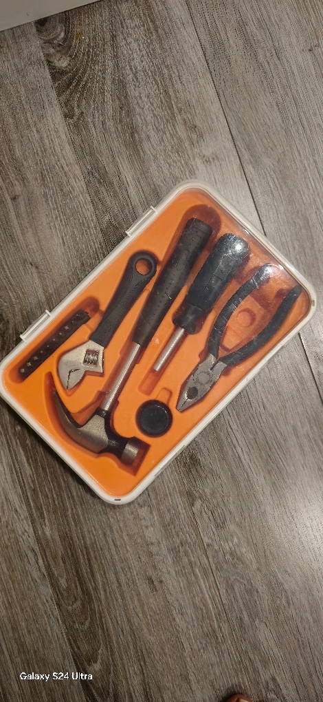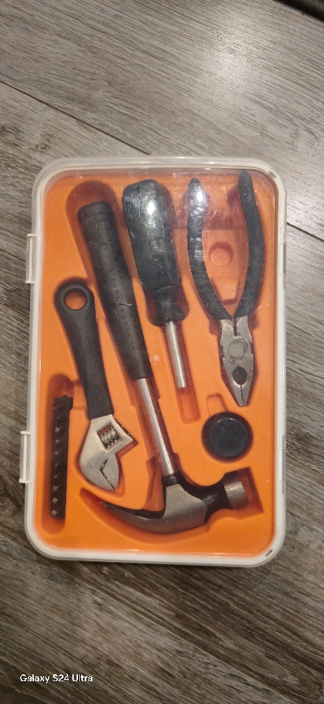 Small tool kit, ideal for minor home repairs. Includes hammer, screwdriver, pliers, wrench and more. Great for beginners or small jobs. Compact and portable.