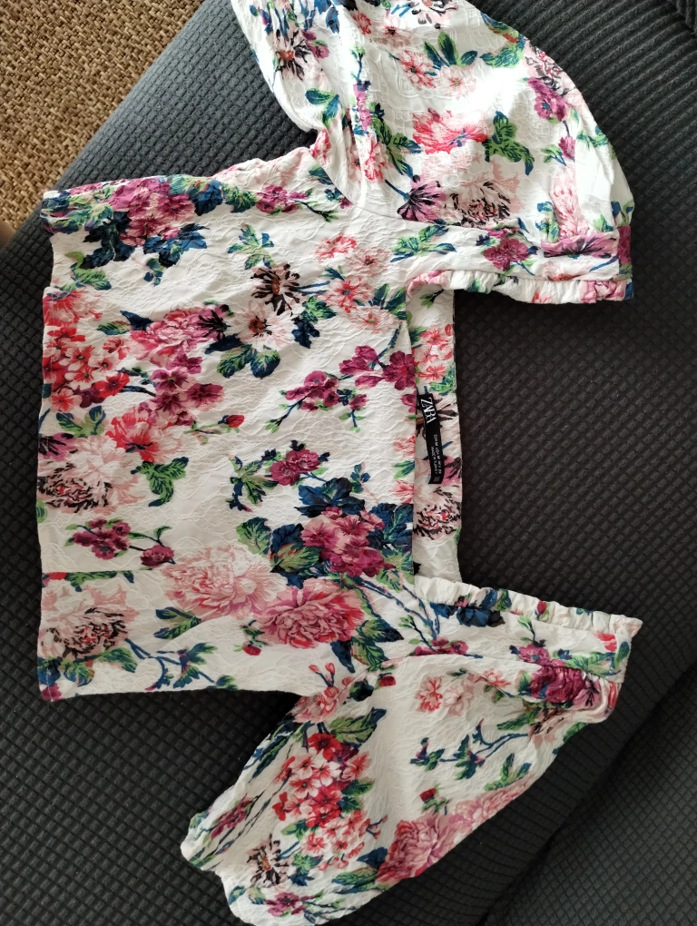 White crop top. Features a floral pattern, puff sleeves, and a square neckline. Lightweight fabric.