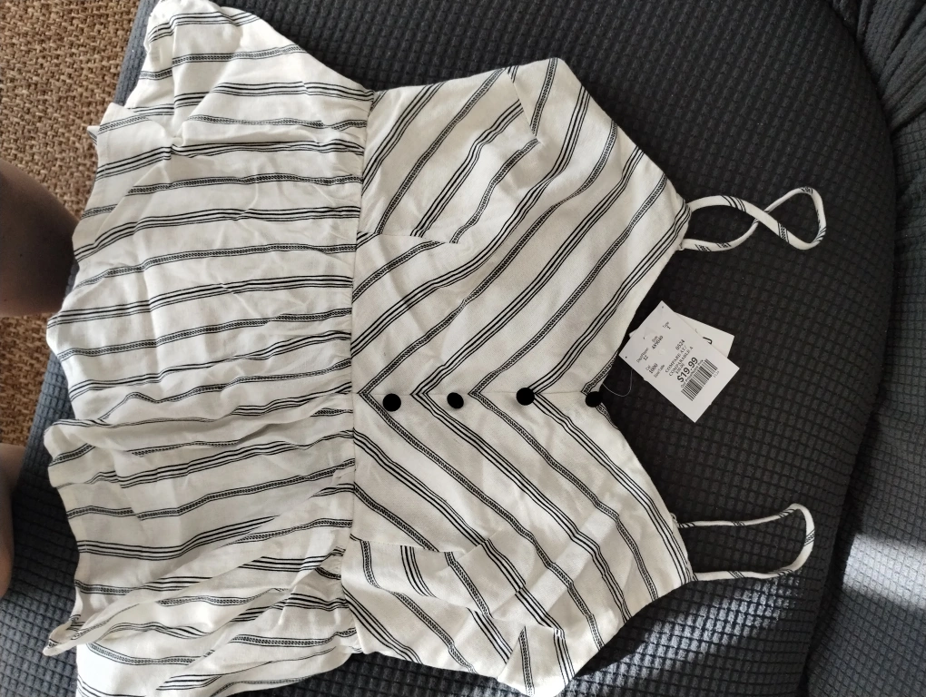 Adorable tank top. Black and white striped pattern. Size L Adjustable straps. Lightweight material. Perfect for summer.