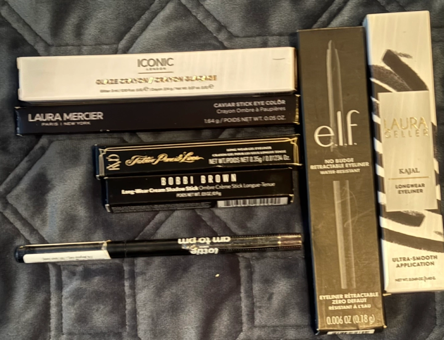Variety of new/unused and sealed eye makeup including eyeliners and eye crayons (shadow).