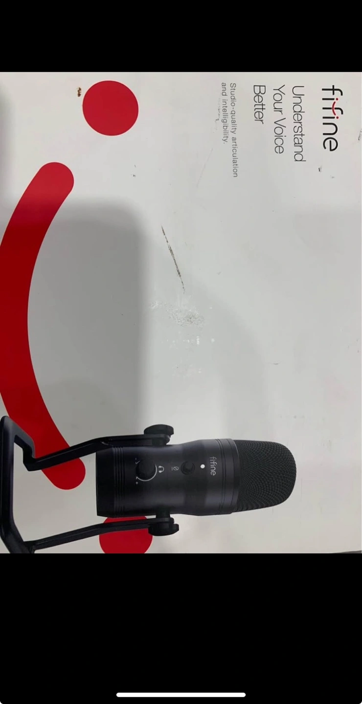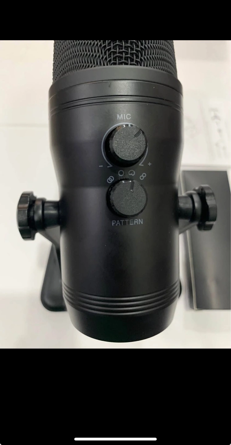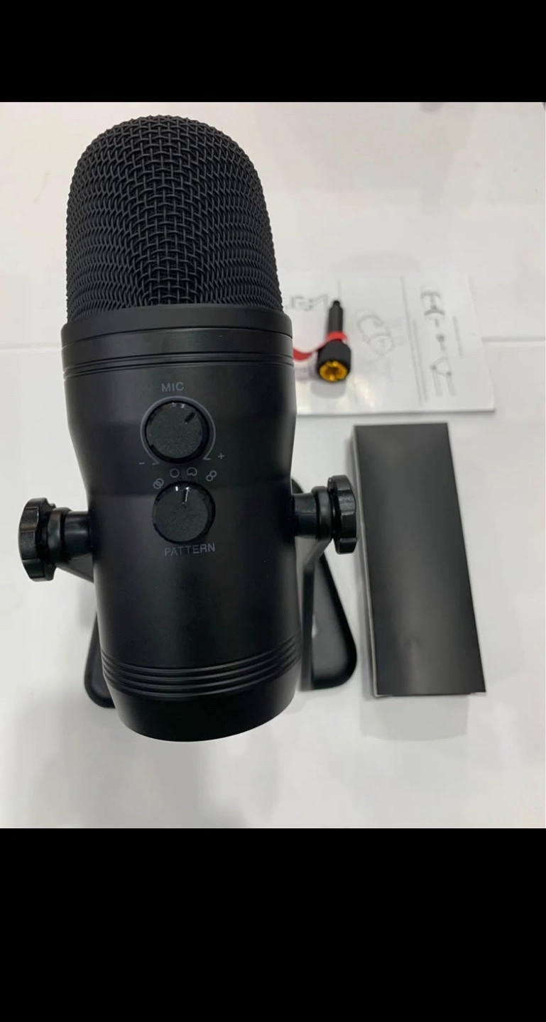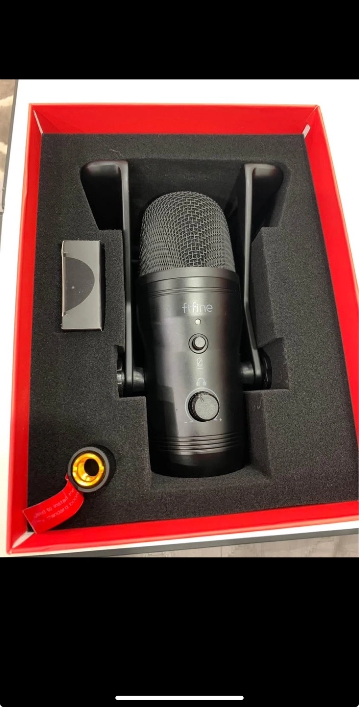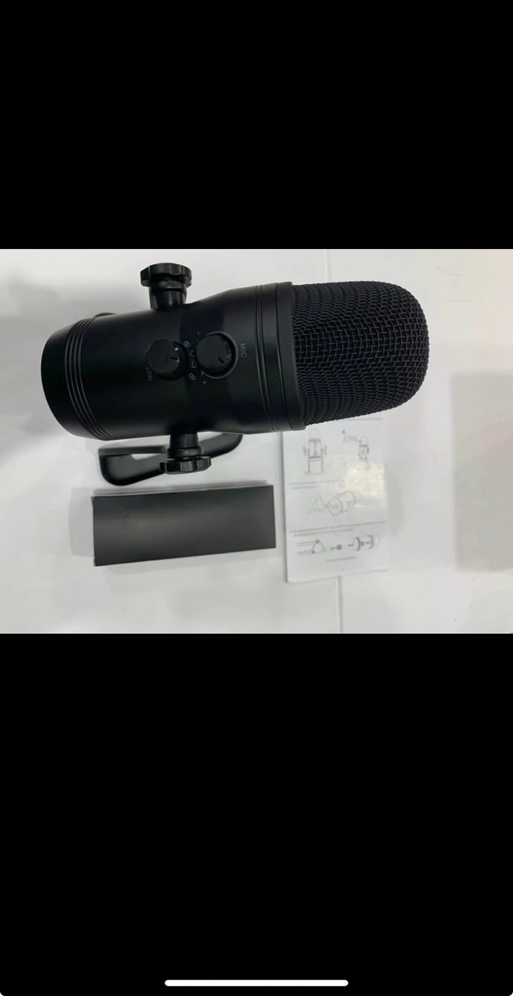 Black USB microphone. Includes shock mount and pop filter. Good for streaming and recording. New in box.