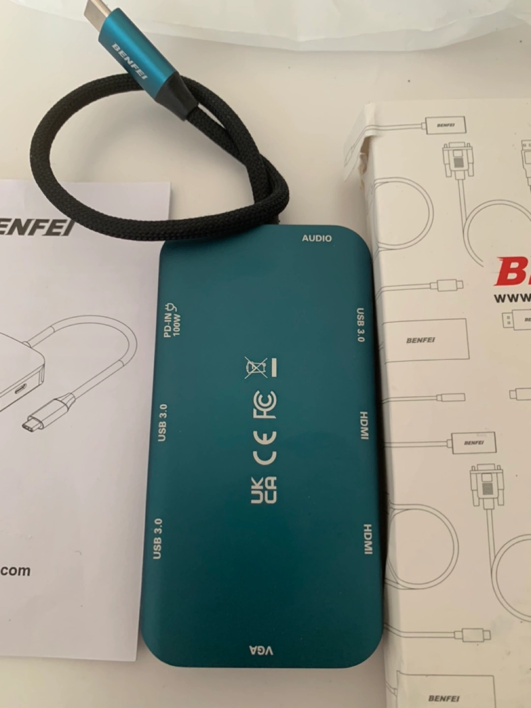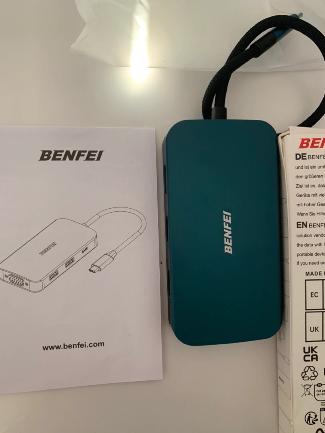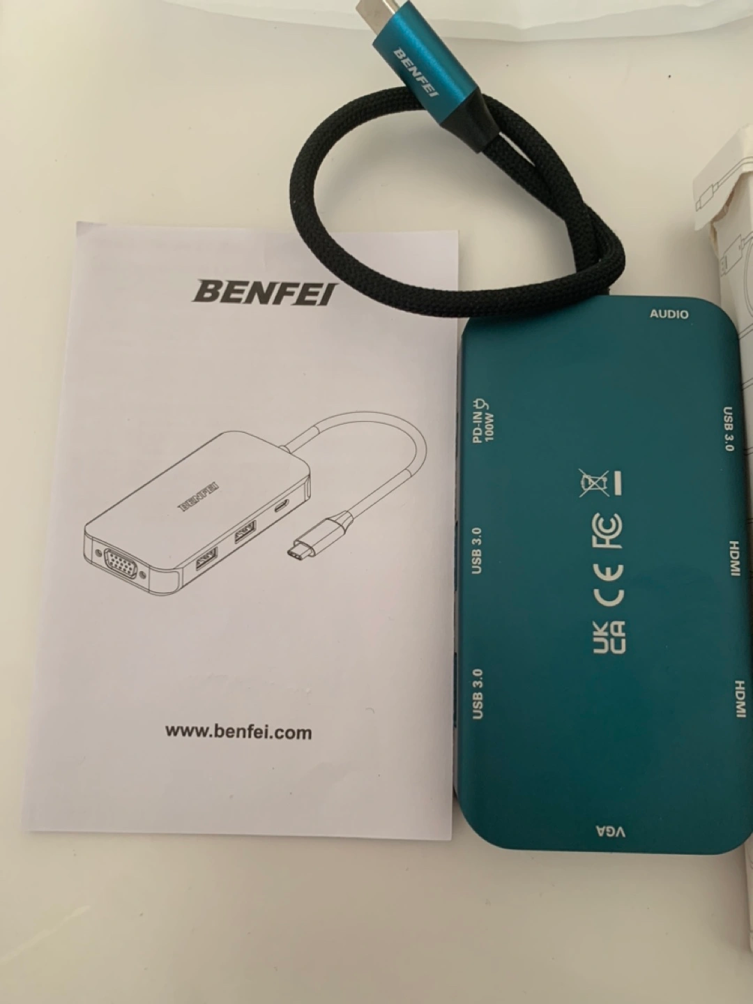 Benfei 8-in-1 USB-C Hub. Multiple ports including HDMI, VGA, USB 3.0, USB-C Power Delivery and Audio. Supports MST multi-screen display. Includes manual and cable.