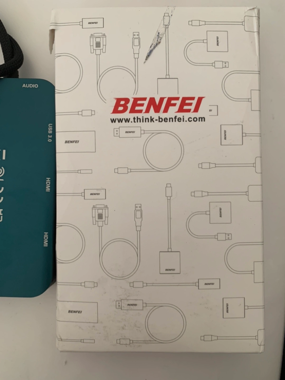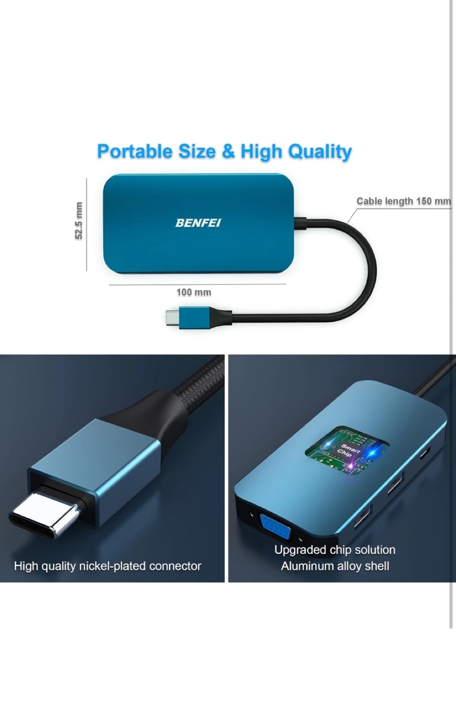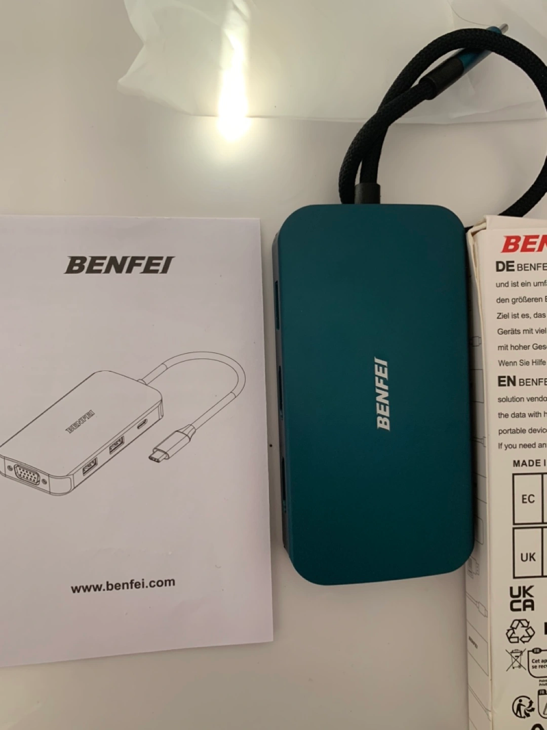 Benfei 8-in-1 USB-C Hub. Multiple ports including HDMI, VGA, USB 3.0, USB-C Power Delivery and Audio. Supports MST multi-screen display. Includes manual and cable.