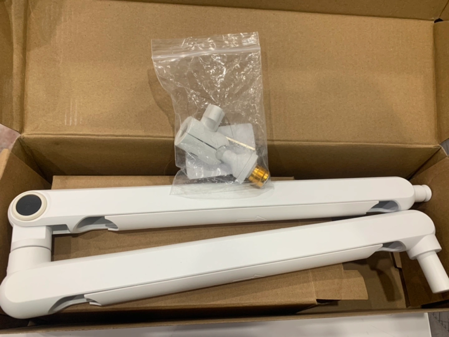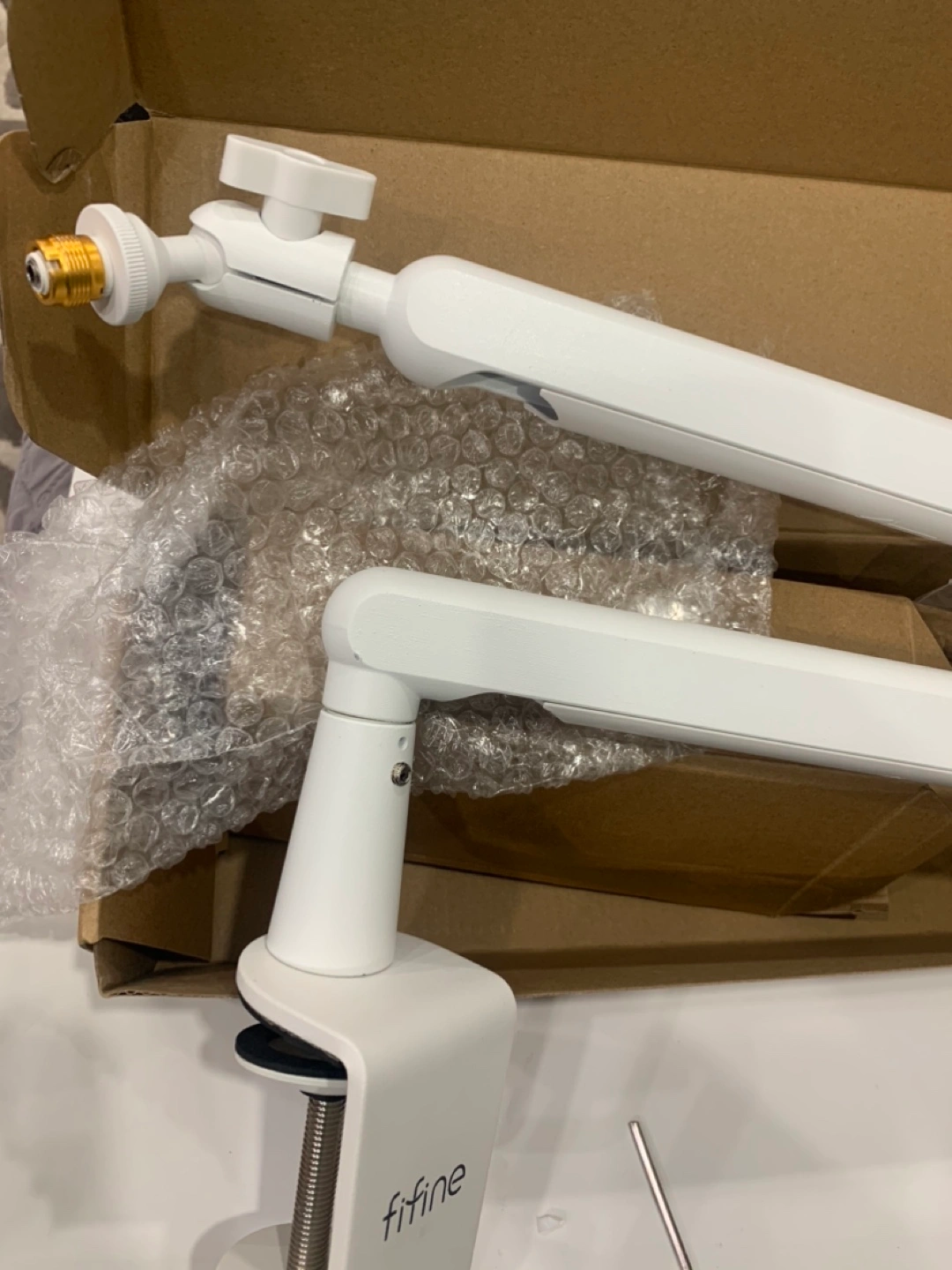 Brand new in box. White, adjustable microphone arm. All-metal construction. Features hidden cable channels. Desk mount. Ideal for podcasting, streaming, or gaming.