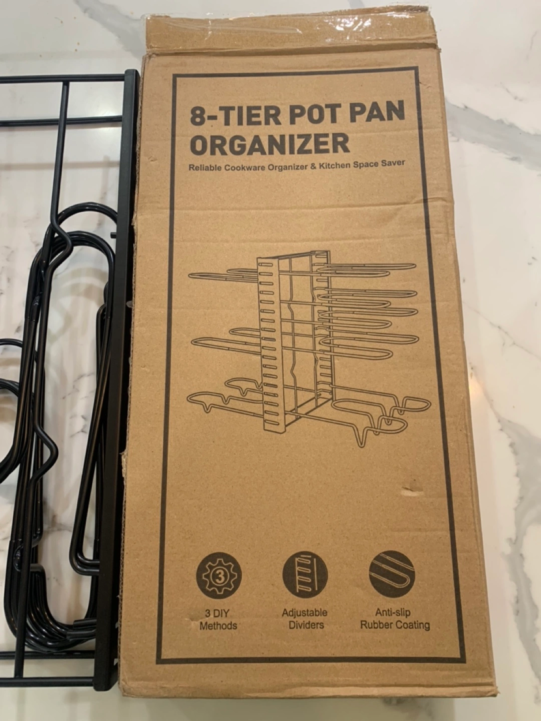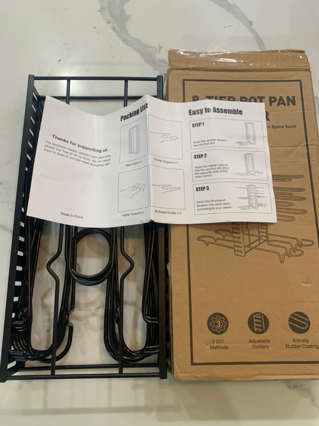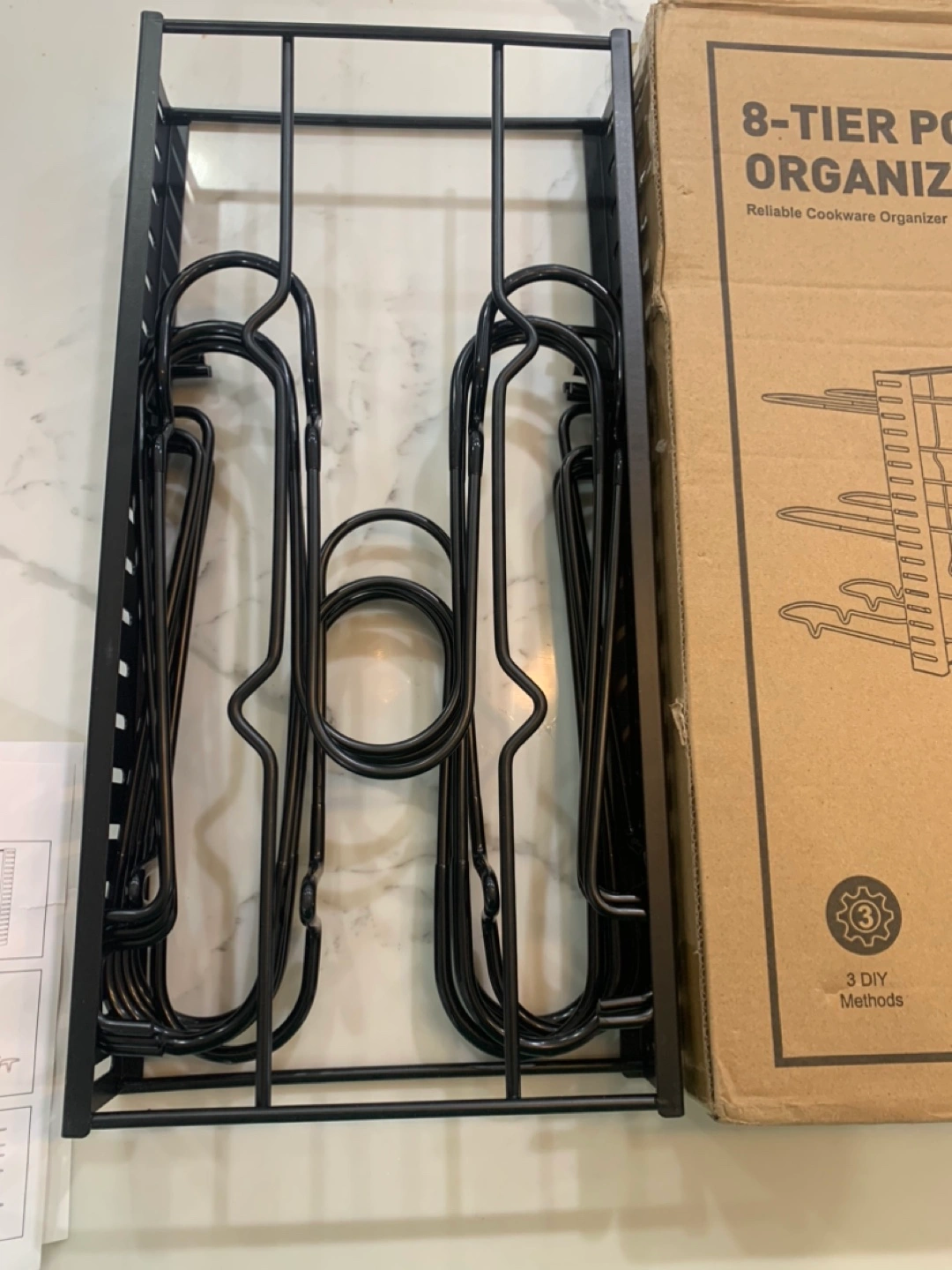 Reliable cookware organizer and kitchen space saver. Eight tiers. Adjustable dividers. Anti-slip rubber coating. Three DIY methods. Easy to assemble. Made in China.
