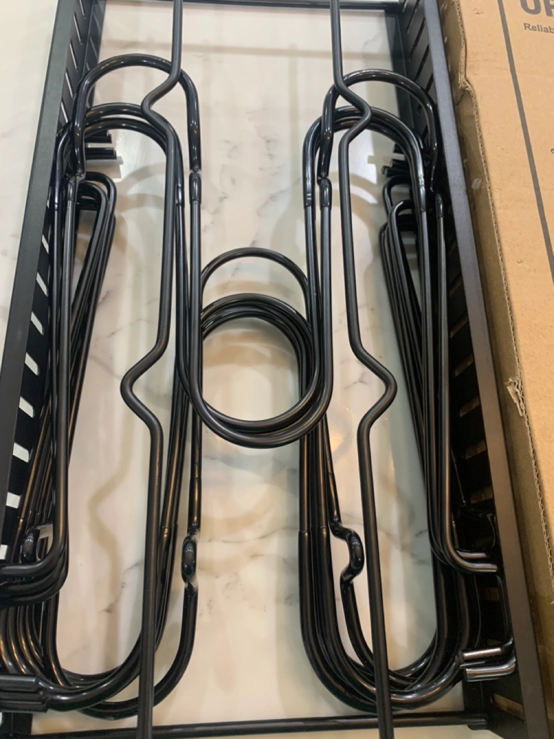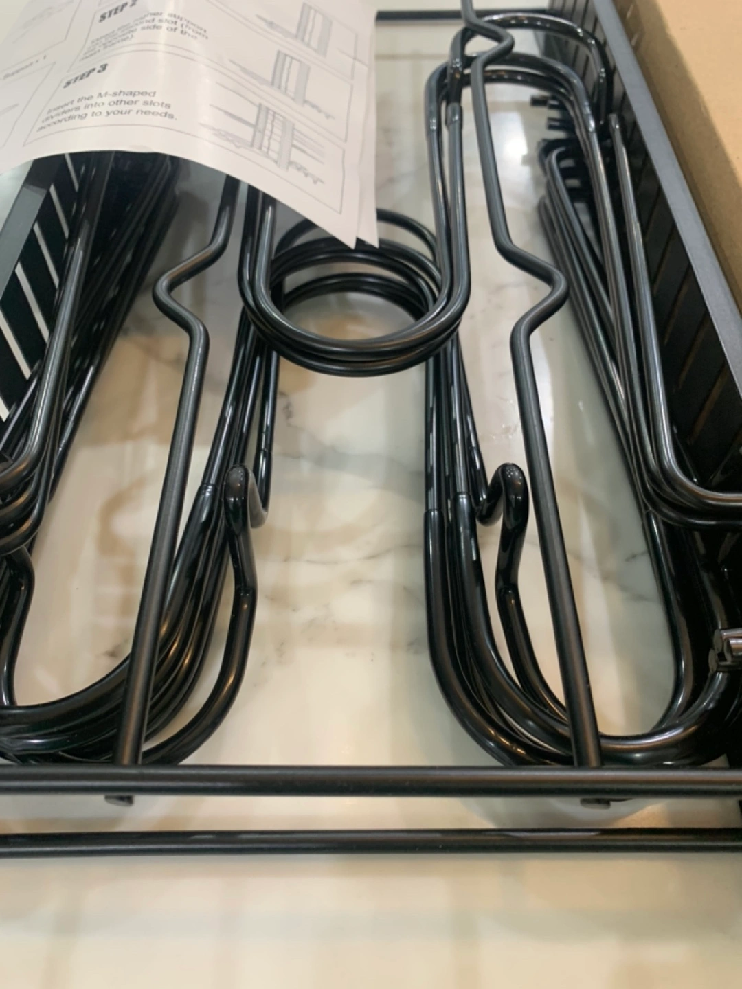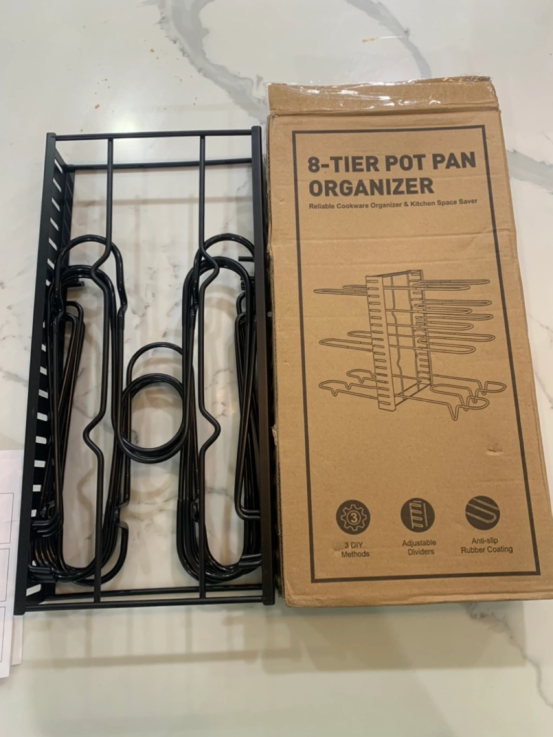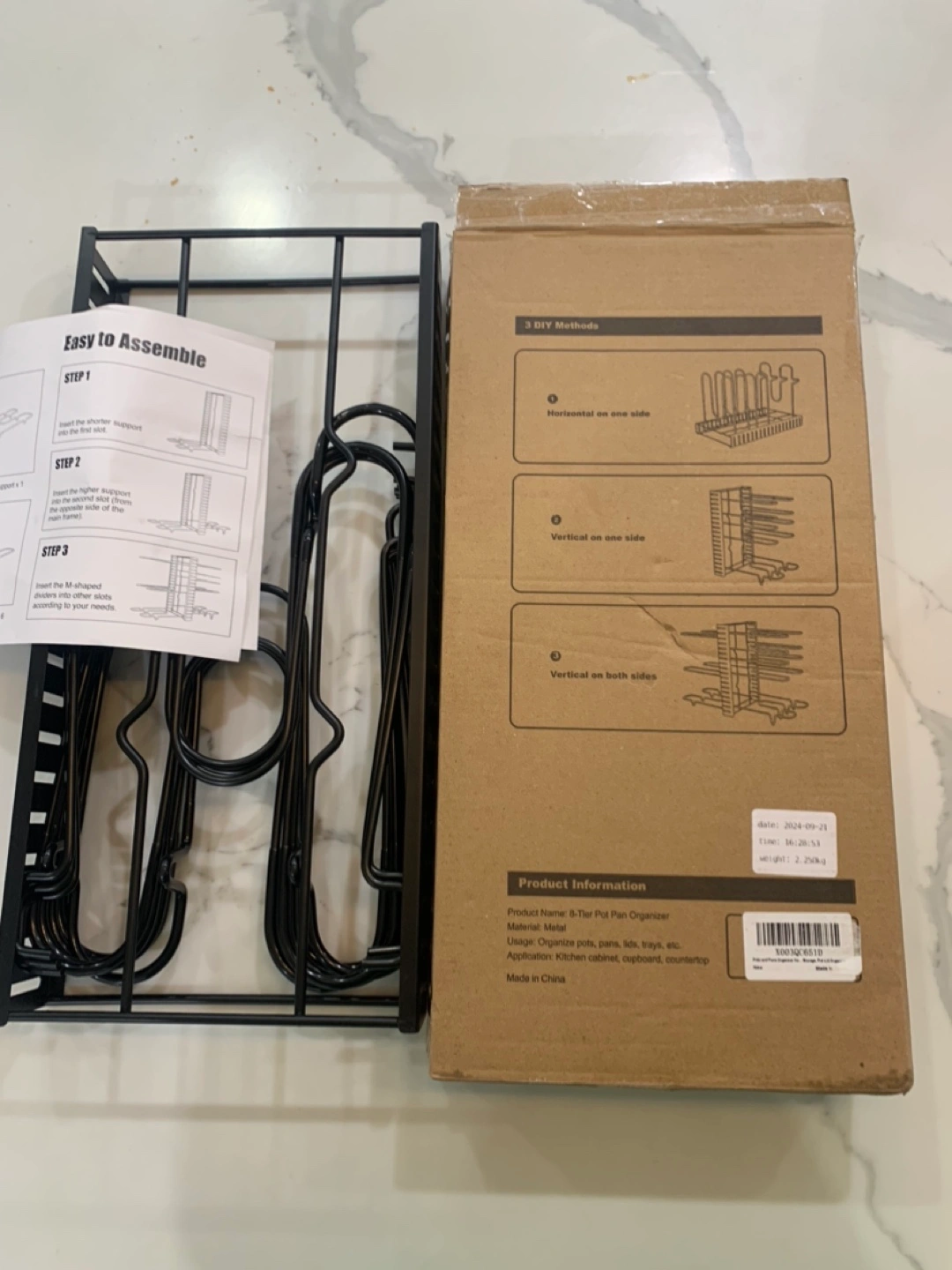 Reliable cookware organizer and kitchen space saver. Eight tiers. Adjustable dividers. Anti-slip rubber coating. Three DIY methods. Easy to assemble. Made in China.