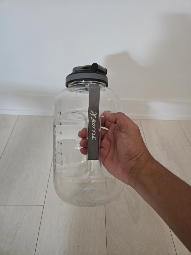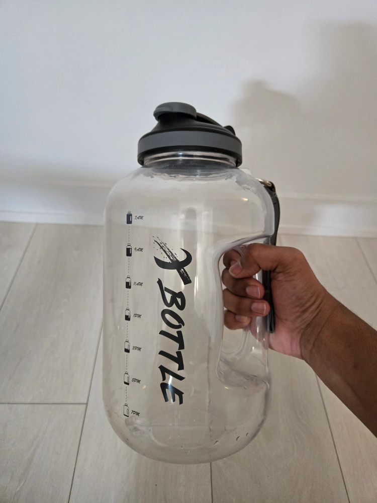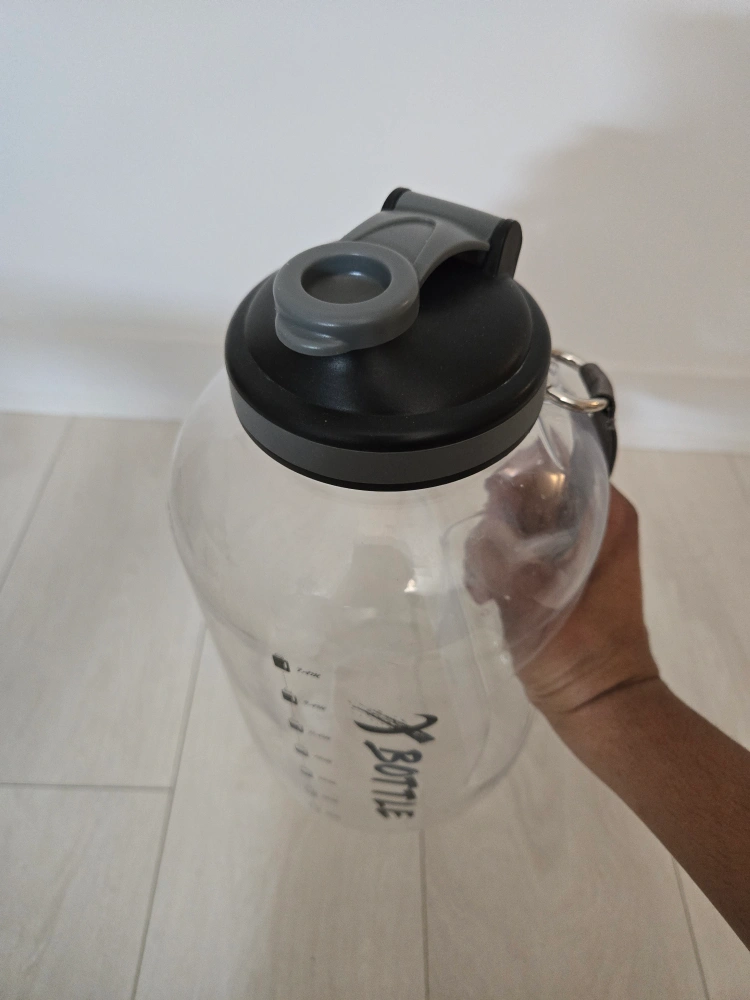 Large capacity water bottle. Clear plastic. Grey lid and handle. Measurement markings. Great for hydration. Barely used