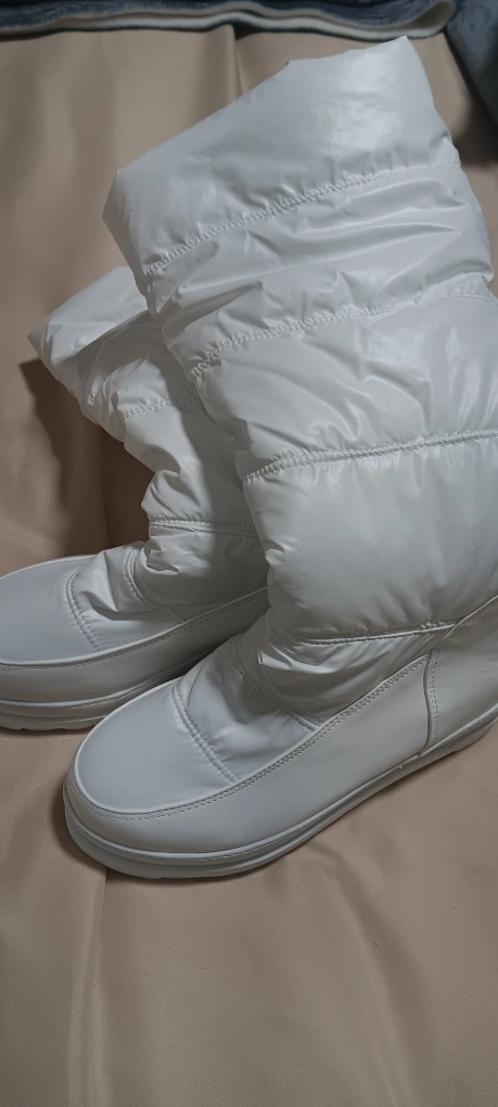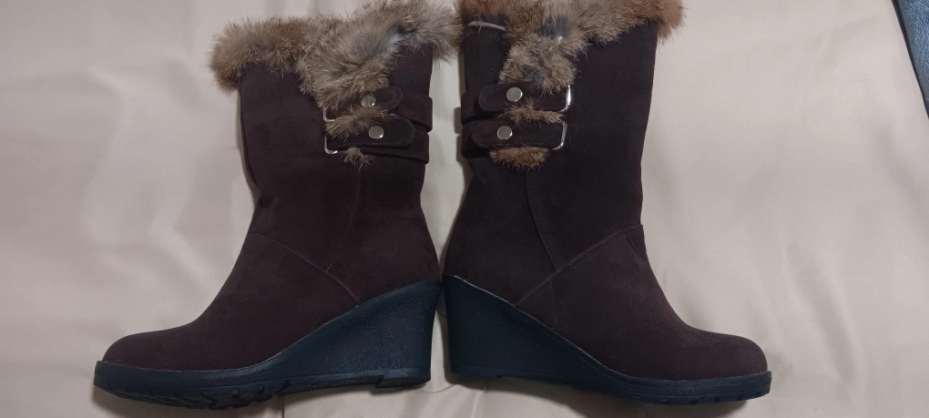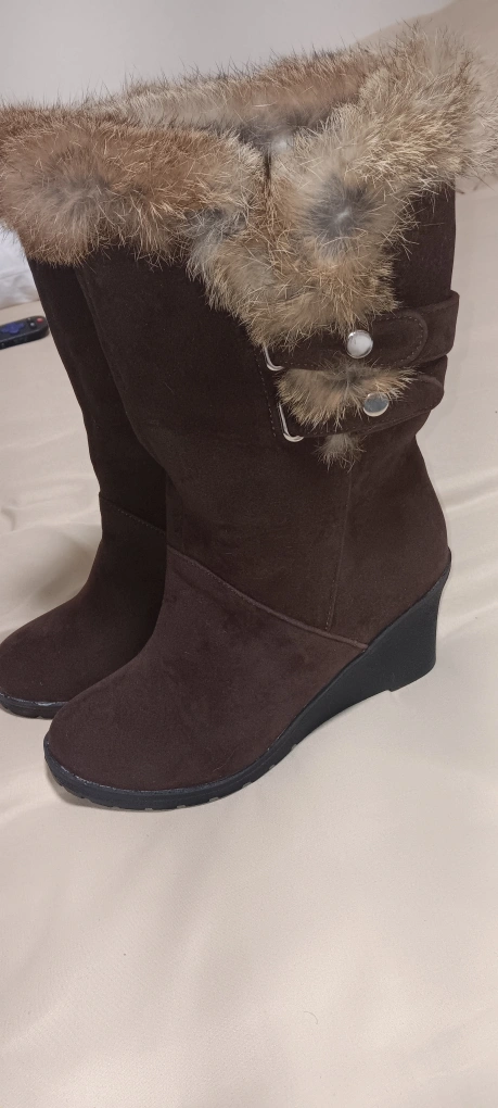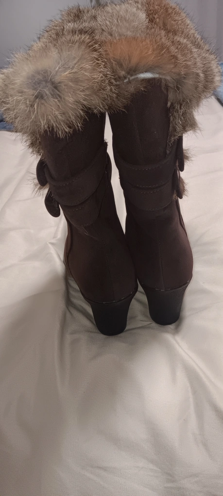 Pair of brown suede-like boots. Features fur trim around the top. Wedge heel. Another pair of white quilted snow boots. Tall boots, great for winter.
