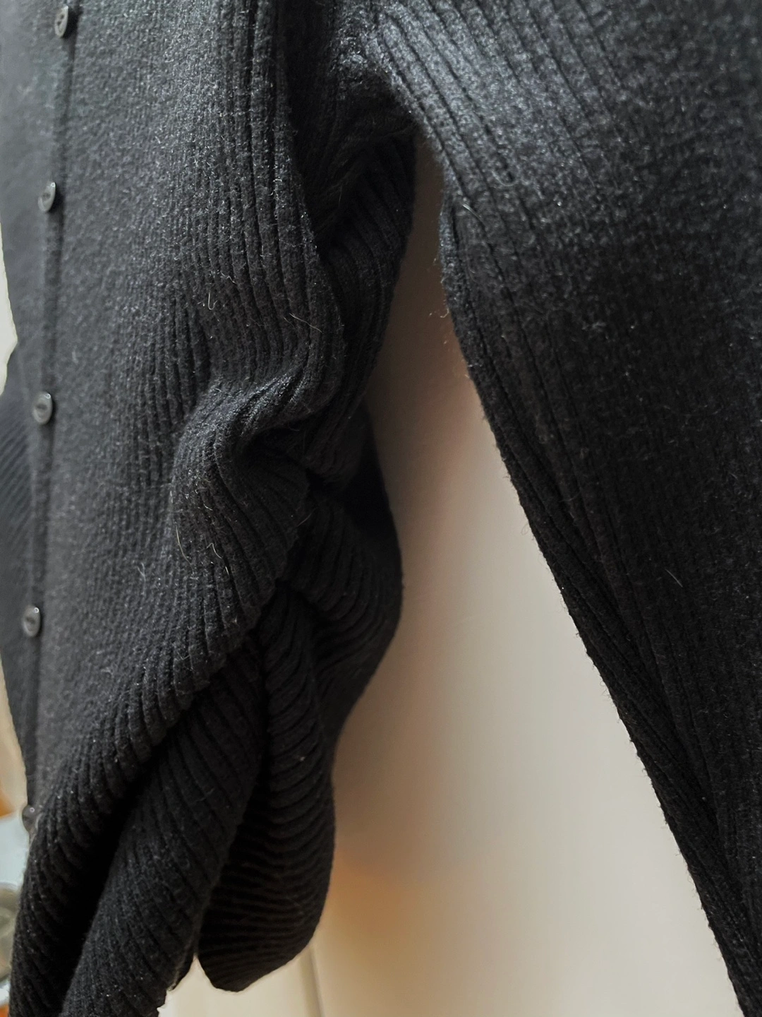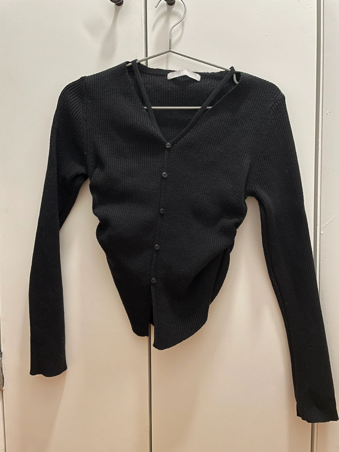 Long sleeve cropped button top. Features a cutout V-neck and button closure. Ribbed knit material. Perfect for office and everyday wear.