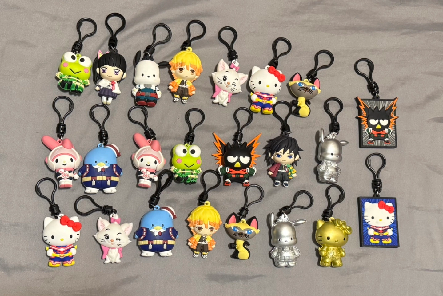 Collection of 25 character keychains. Features various anime and Sanrio characters. Includes My Hero Academia, Demon Slayer, and Hello Kitty characters.