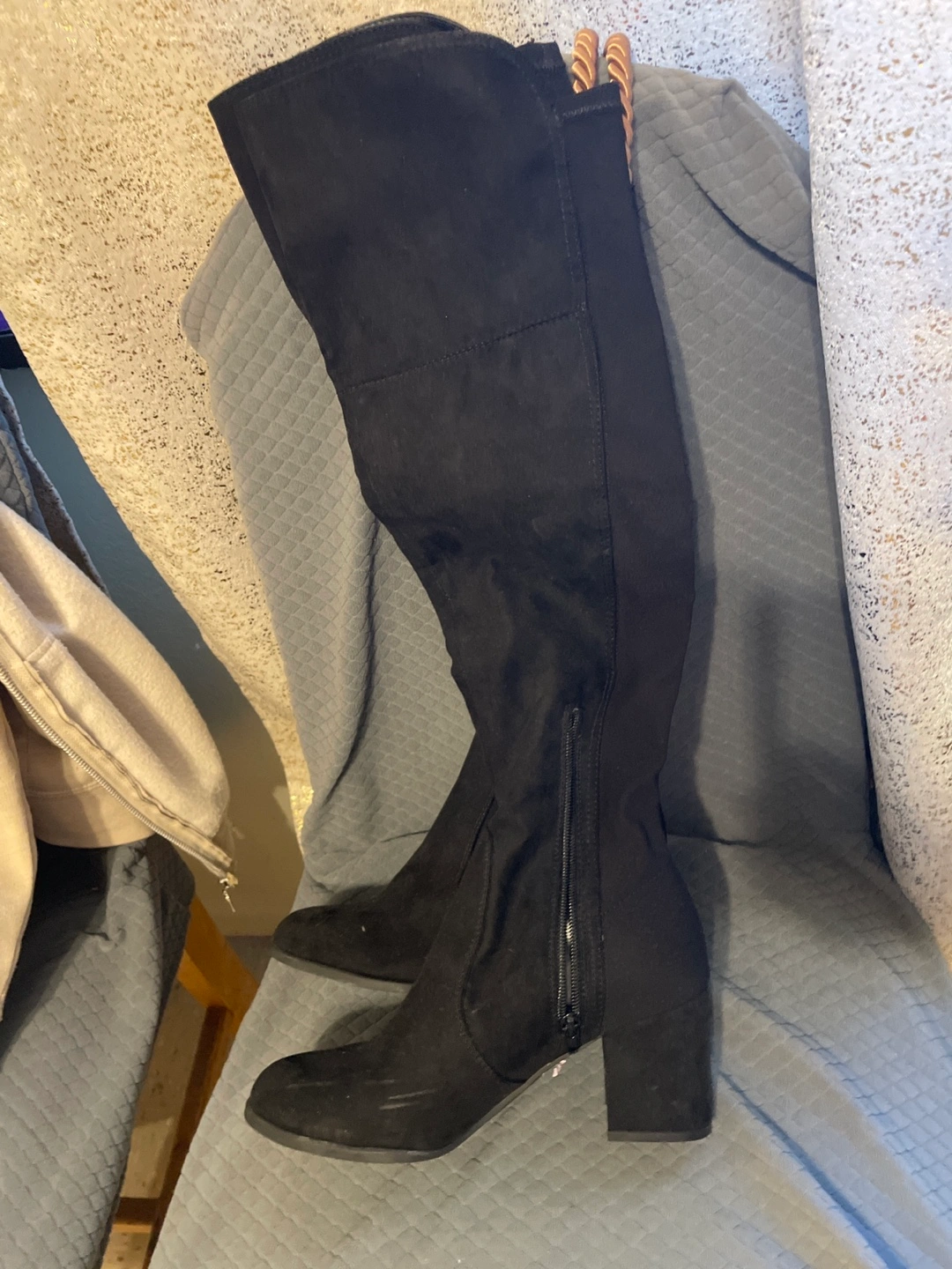 475Black suede over-the-knee boots. Size 8.5M. Block heel. Side zipper. Textile upper. Made in China. Women's Over the Knee Black Boots Size 8.5M