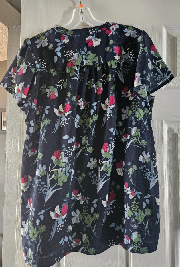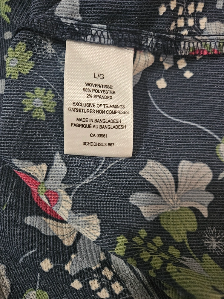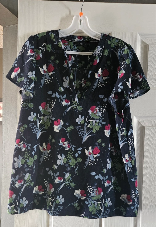 Women's size large floral blouse. Short sleeves. V-neck. 98% polyester, 2% spandex. Made in Bangladesh. Worn once. Non-smoking.