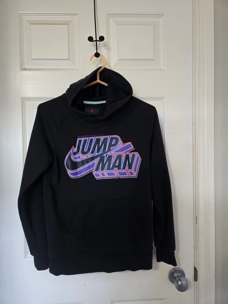 Black Jordan youth hoodie. Features Jumpman logo. Mesh panel at back of hood. Great condition. Price firm.